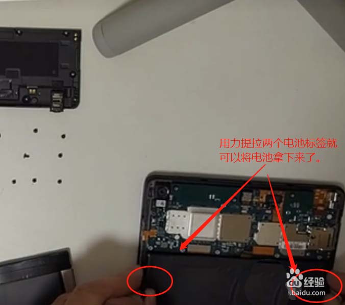 8、用力提拉兩個電池標簽,就可以把電池剝下來了,因為背部是用膠水粘著的,如圖所示: