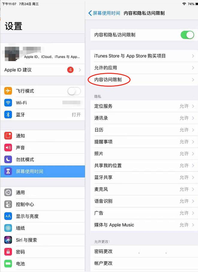 2、將“內(nèi)容和隱私訪問限制”調(diào)整為開啟狀態(tài)。