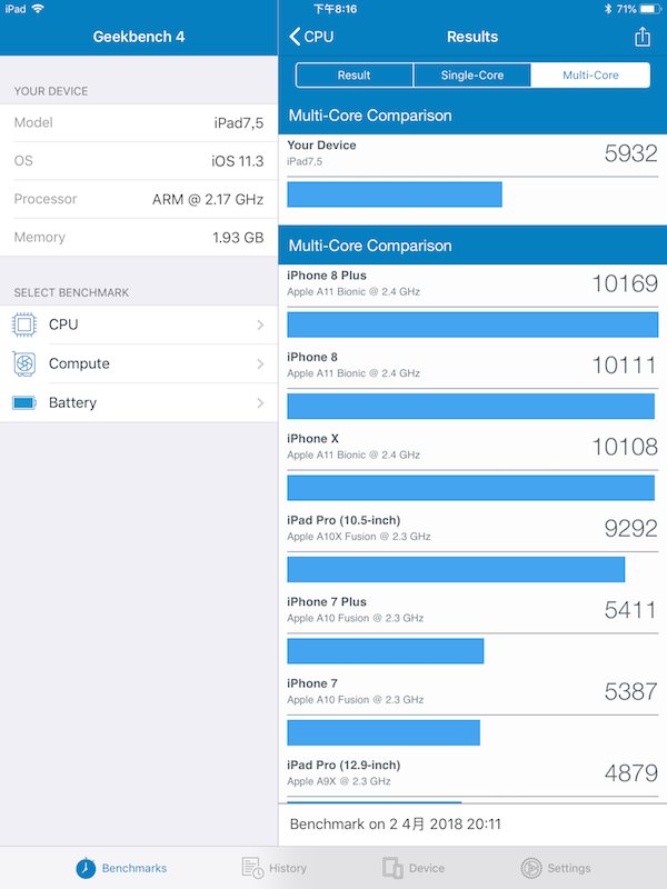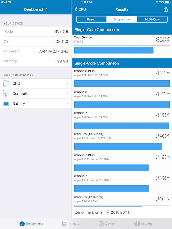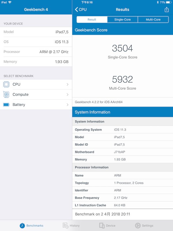 在GeekBench 4的CPU性能測試中,2018款9.7英寸iPad取得了單核3504,多核5932的成績,單核心的成績雖然略高于iPhone 7 Plus,但是多核心的成績只有當(dāng)今旗艦設(shè)備iPhone X性能的60%。
