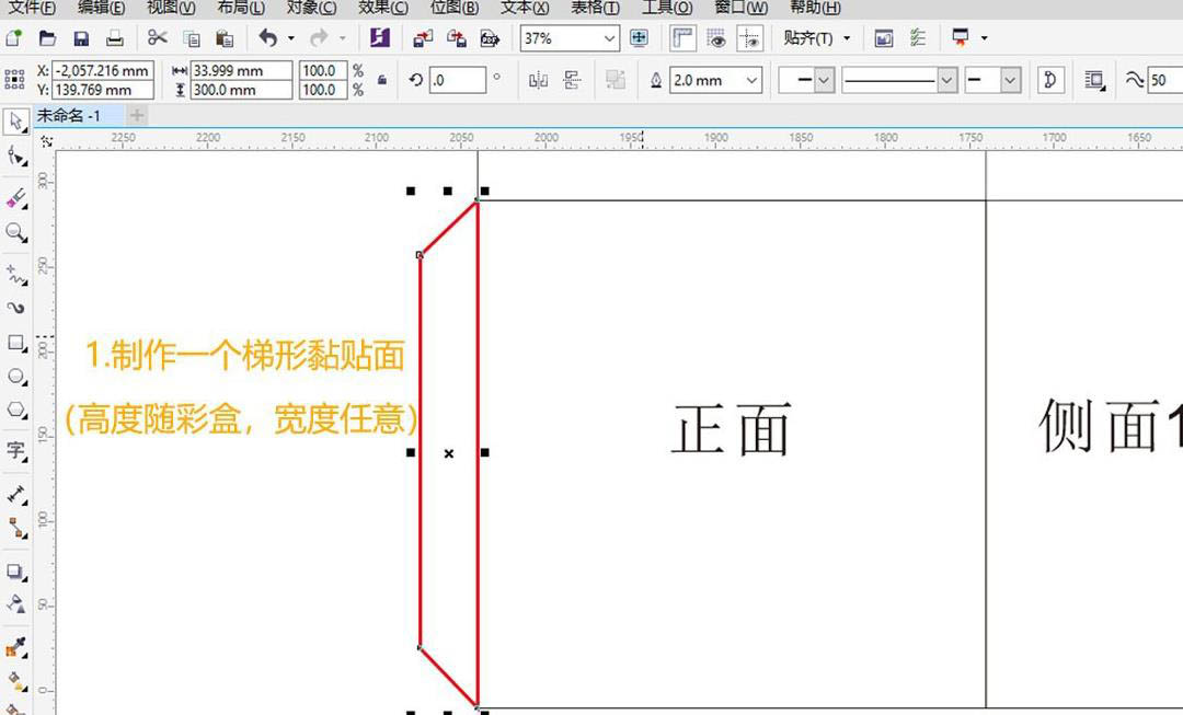 黏貼面與正面相連,用于連接彩盒的正面和側面,形成封閉,畫一個梯形形狀面,與正面連接,(高度隨彩盒,寬度任意)