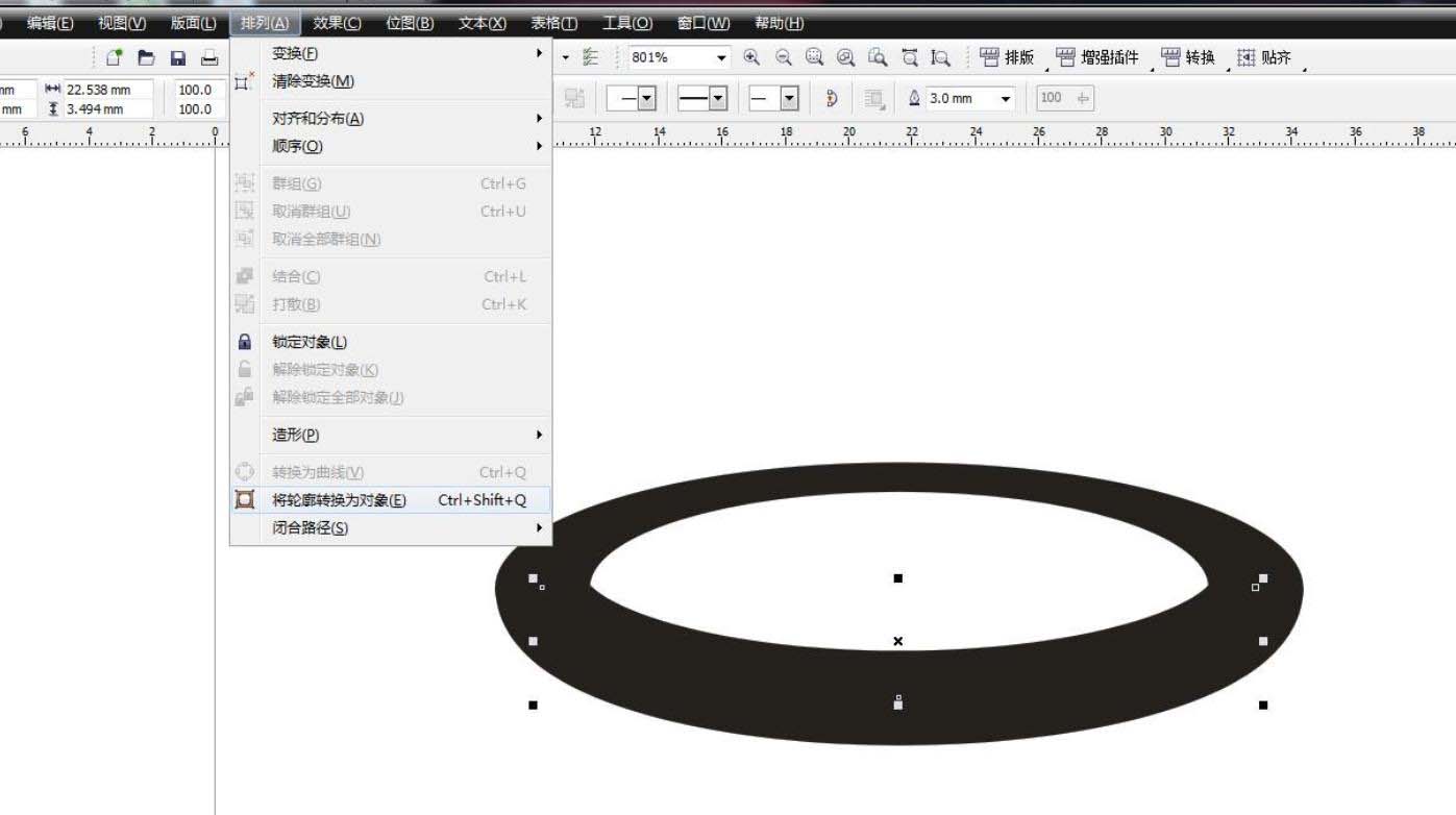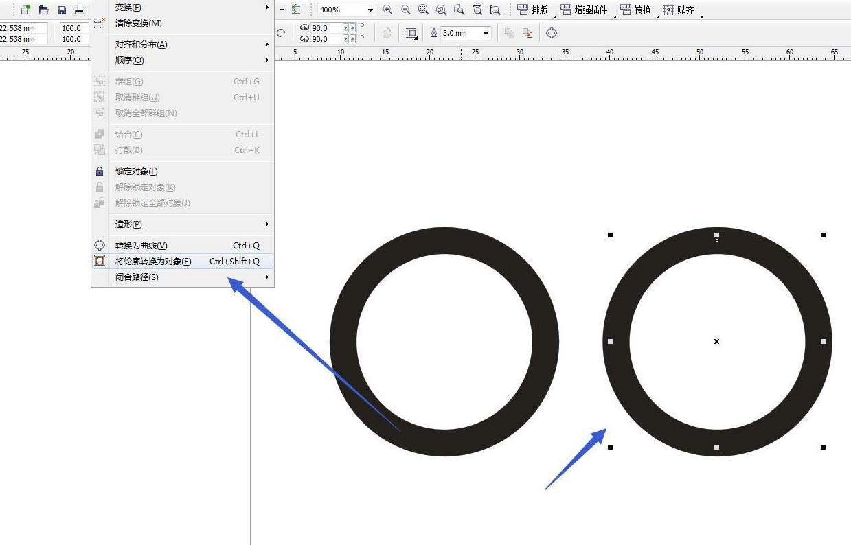 將這個圓環復制一個,向右側移動,然后點擊右鍵復制,然后將右側的這個轉化為對象