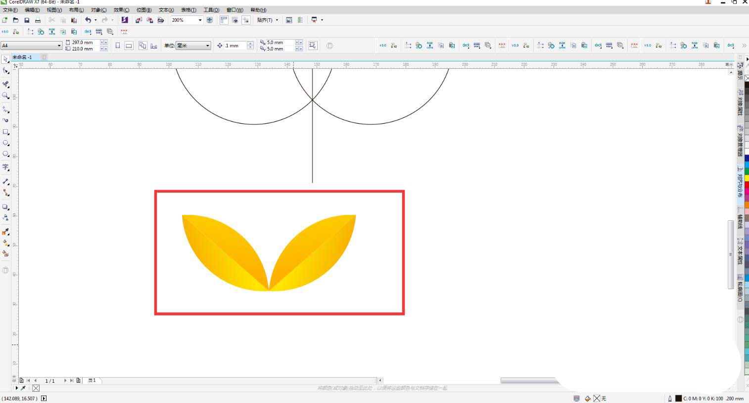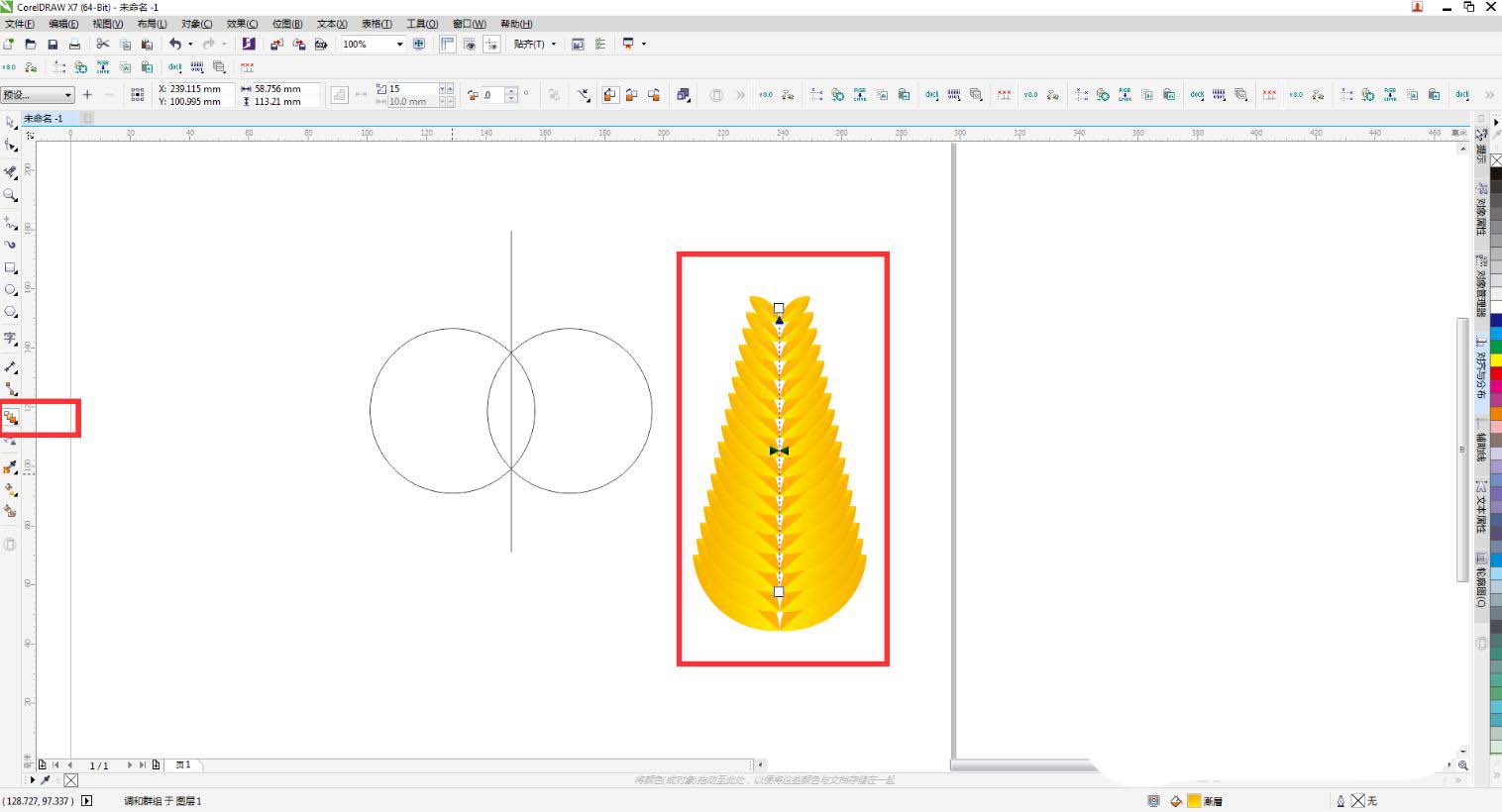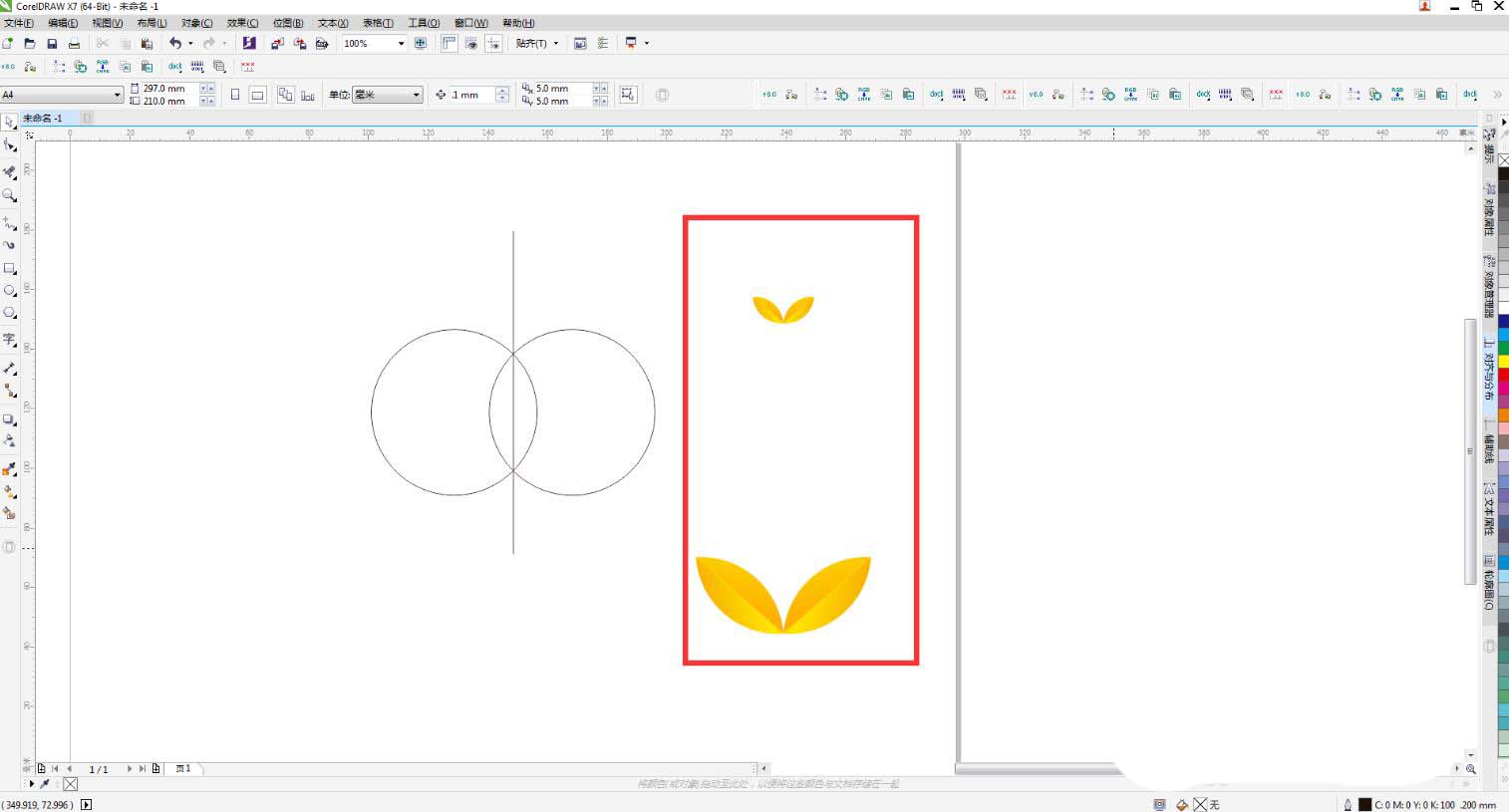 2、點擊手繪工具,按住Ctrl鍵繪制一條垂直線與兩個圓垂直居中,再點擊智能填充工具給中間的小葉子填充成顏色。