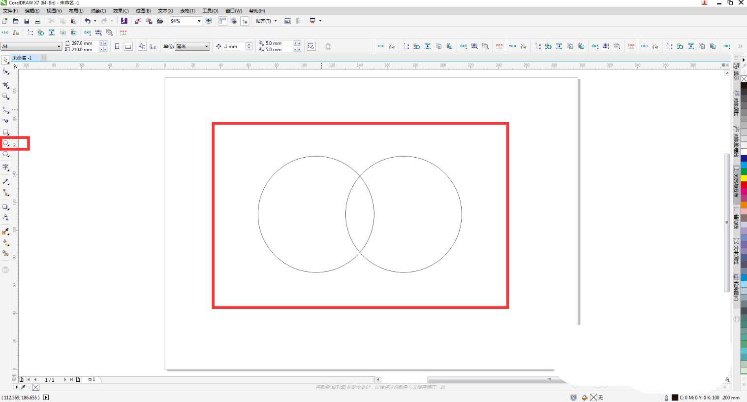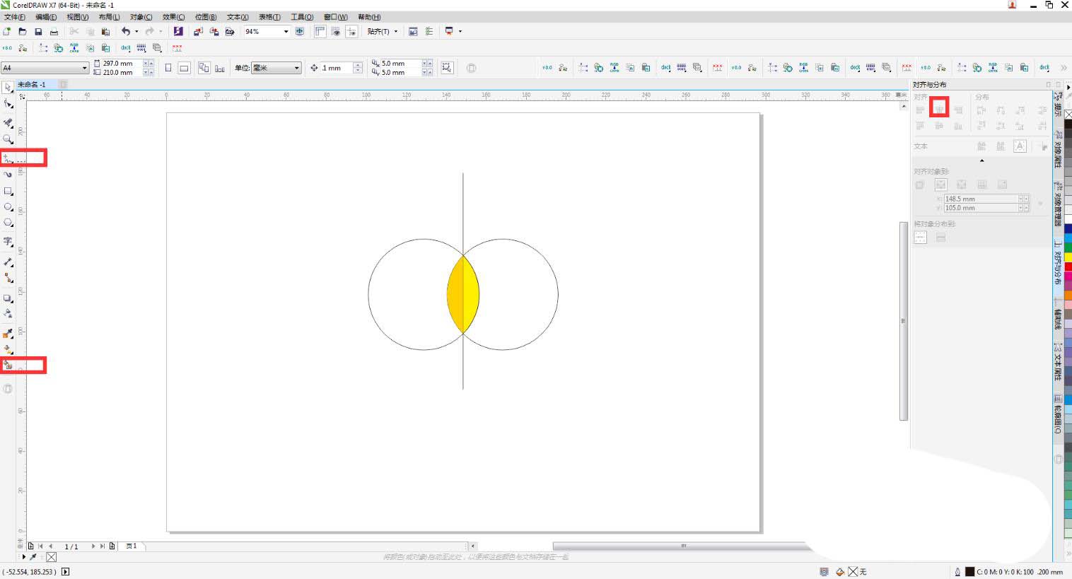 1、打開cdr軟件并新建文檔,點擊橢圓工具按住Ctrl鍵繪制一個正圓,按住Shift鍵水平拖動正圓,點擊鼠標右鍵復制正圓使兩個正圓相交,按Ctrl+g組合起來。