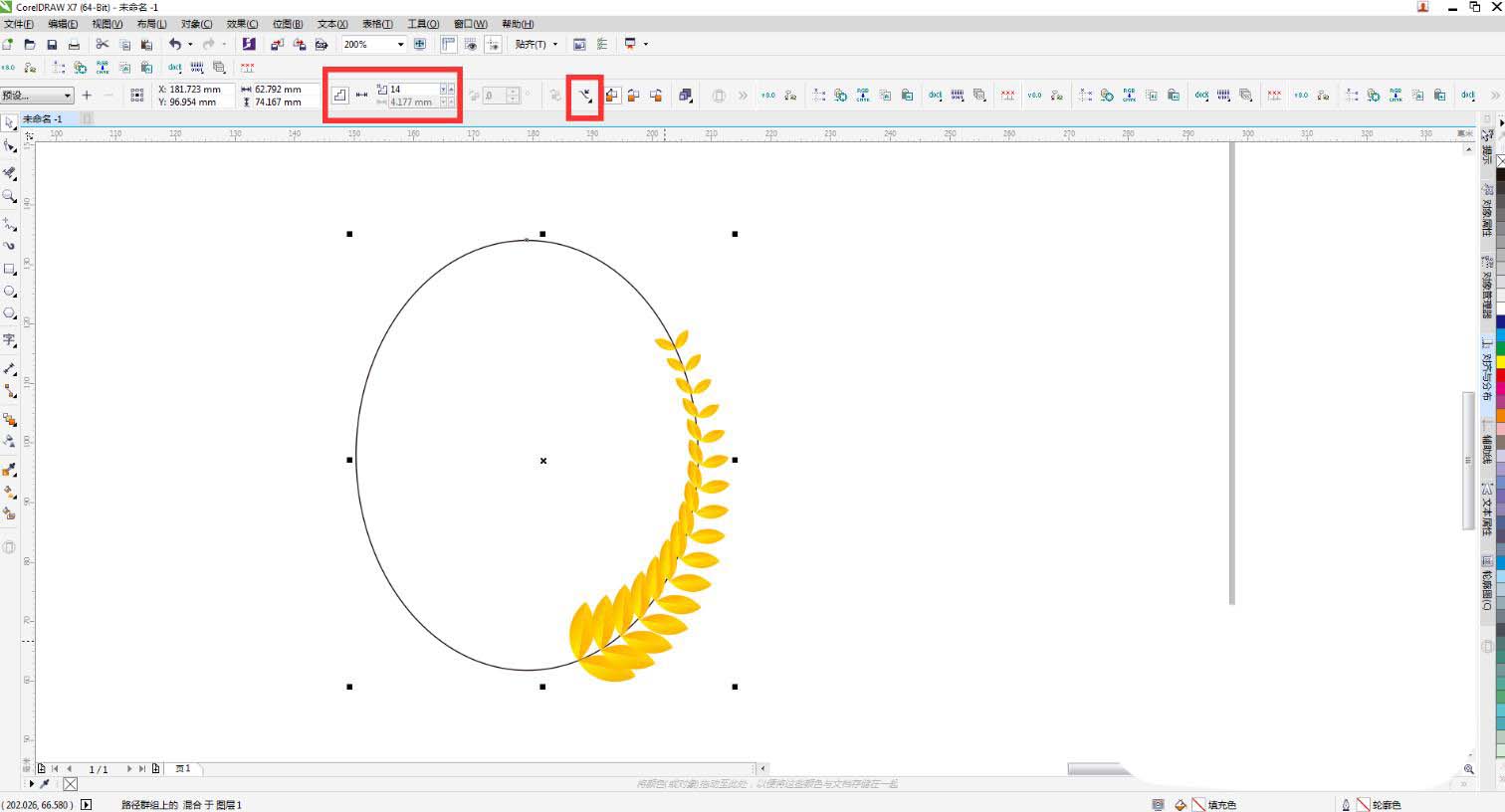 5、點擊橢圓工具繪制一個橢圓,選擇調和圖形,點擊新路徑使調和圖形沿橢圓路徑,調整葉子的個數和步長,角度。
