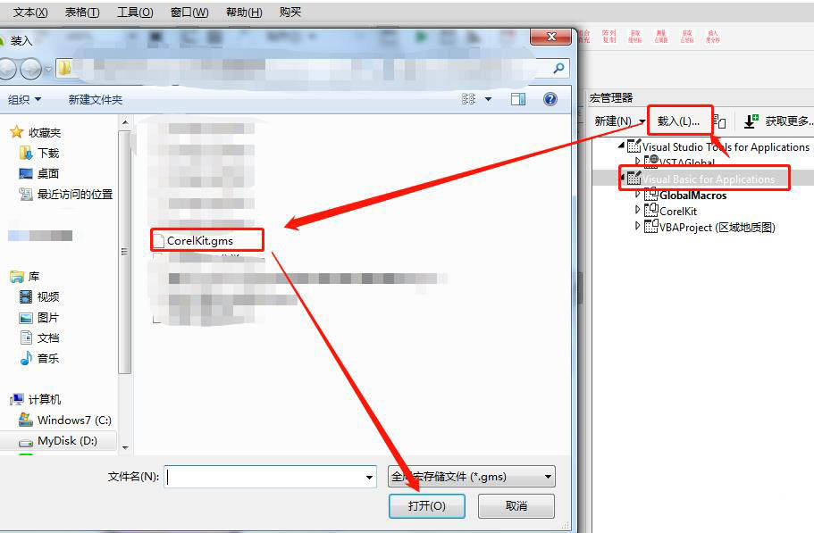 3、選中宏管理器中的Visual Basic for Applications,點上面的加載,找到CorelKits插件加載完成。