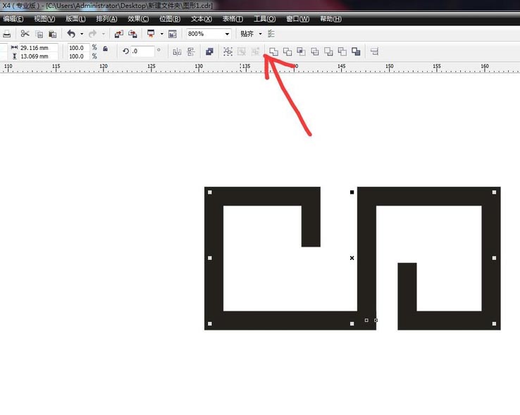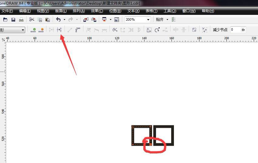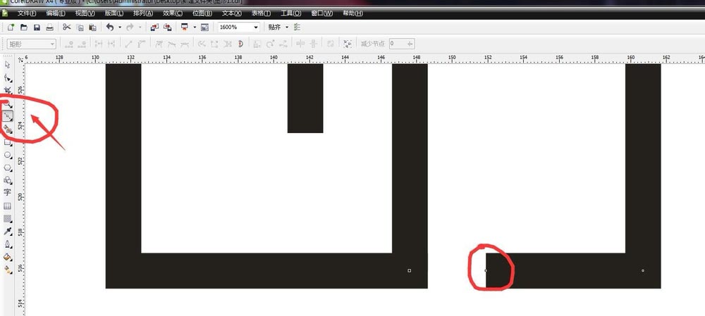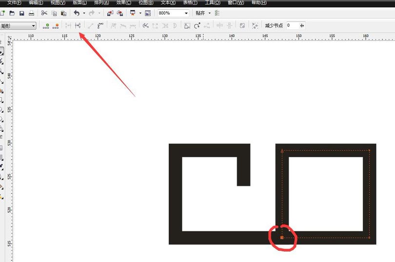 3、斷開曲線。選擇形狀工具,然后選中第一個(gè)小矩形右下角的節(jié)點(diǎn),在屬性欄中選擇斷開曲線