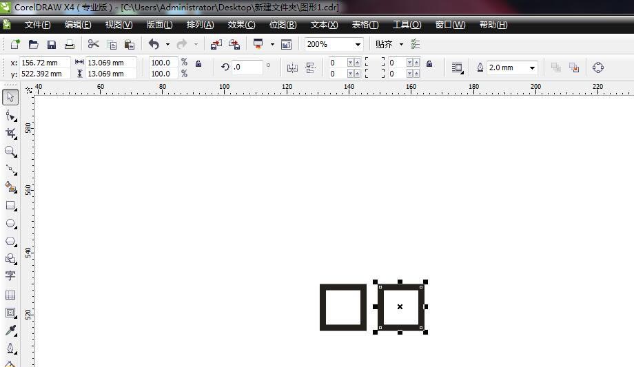 1、繪制兩個(gè)小的矩形框。首先啟動(dòng)CorelDRAW軟件,新建一個(gè)文件,然后在工具欄中選擇矩形工具,繪制一個(gè)小的矩形,加粗輪廓,向右側(cè)復(fù)制一個(gè)