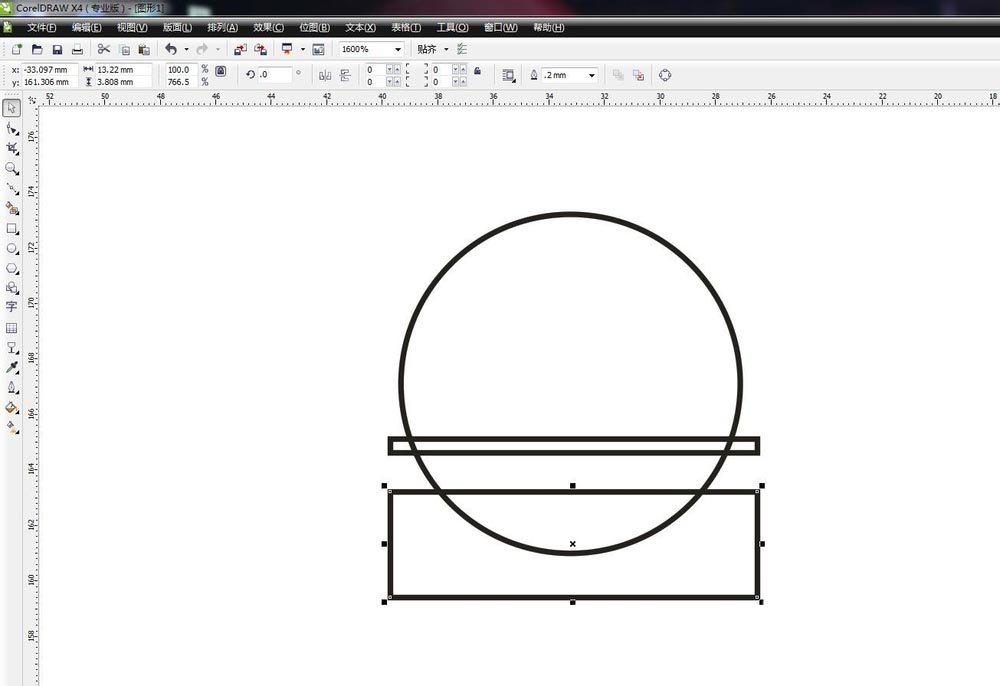 在圓的下半部分繪制兩個矩形,如下圖,要比圓形長出一部分,上邊的窄,下邊的寬一點,覆蓋圓形