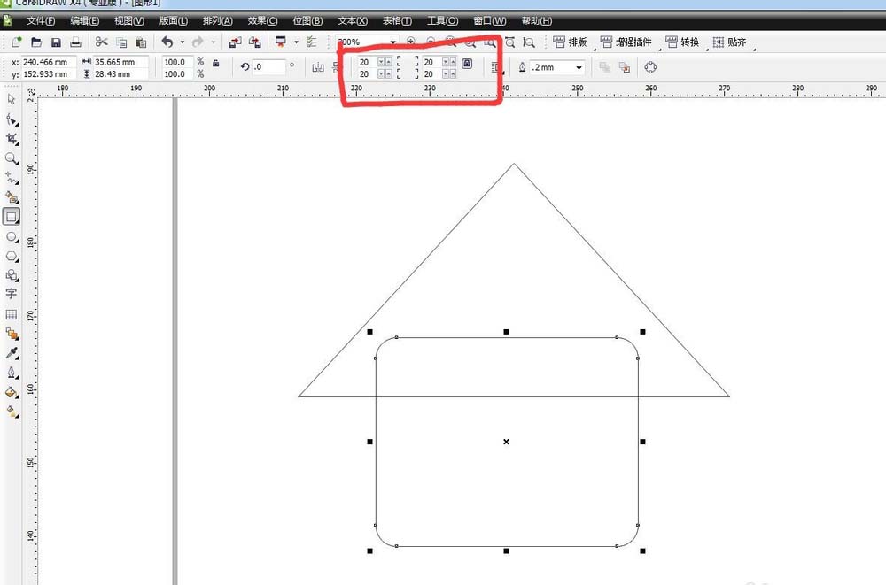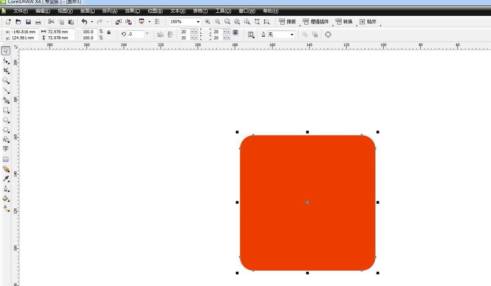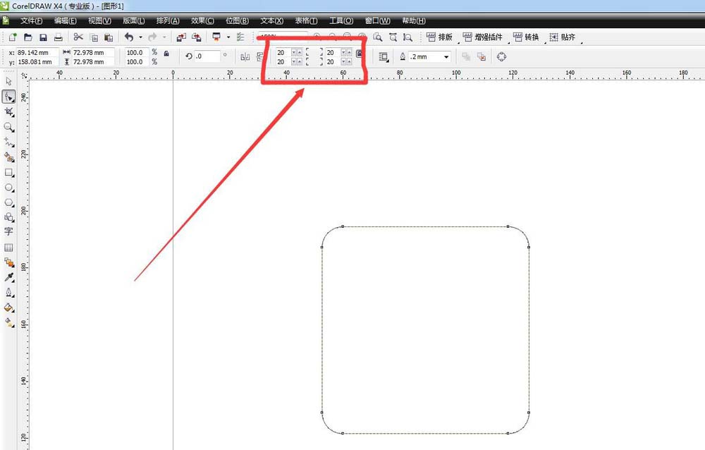 啟動(dòng)CorelDRAW軟件,新建文件,選擇工具欄中的矩形命令拖拽一個(gè)矩形,然后在屬性欄種設(shè)置圓角度數(shù)為20,也可以使用形狀工具調(diào)整