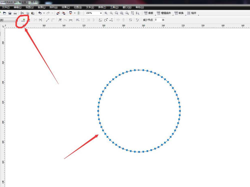 轉曲之后,全部框選,使用形狀工具框選,可以看到有四個節點已經被選到了,在屬性欄中有一個添加節點的圖標,多點擊幾次就可以添加多個節點了