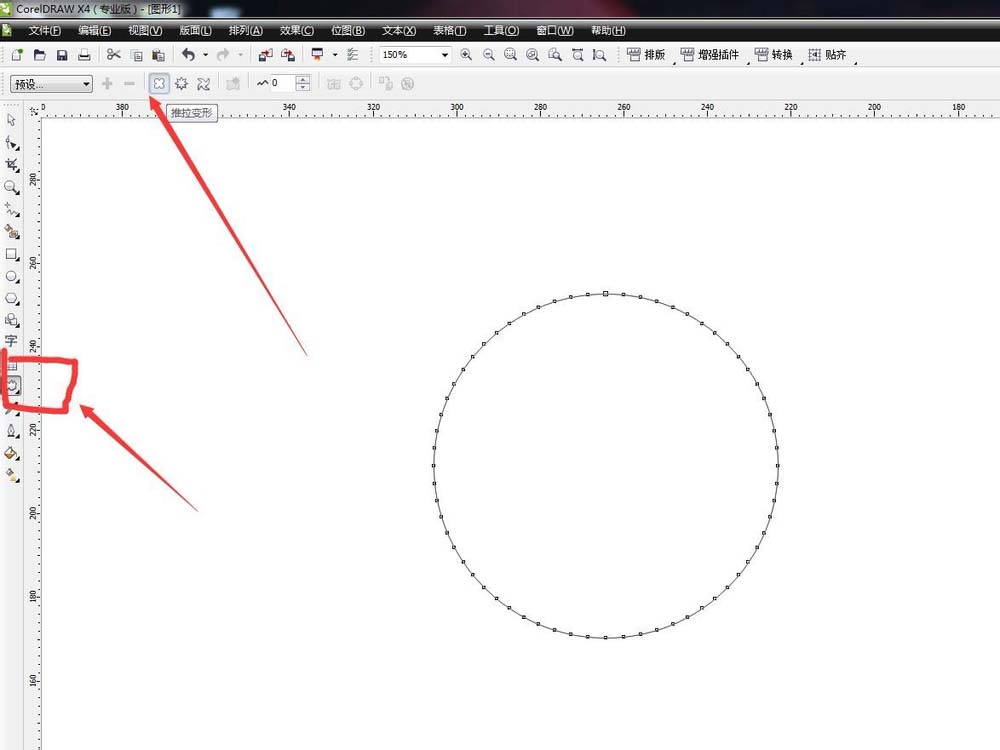選擇工具欄中有一個變形工具,在屬性欄中選擇第一個推拉變形,不同的變形,得到的效果是完全不同的,然后拖動鼠標變形