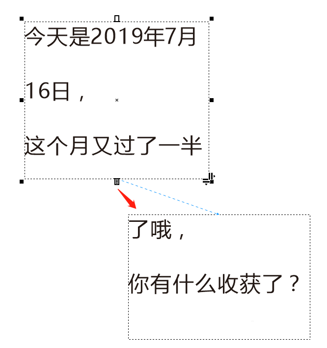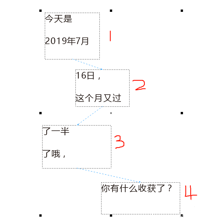 2、對于一段文本內容,我們可以使用多個連接文本框來進行顯示。如下圖。連接的文本框之間會有藍色虛線剪頭相連接哦。
