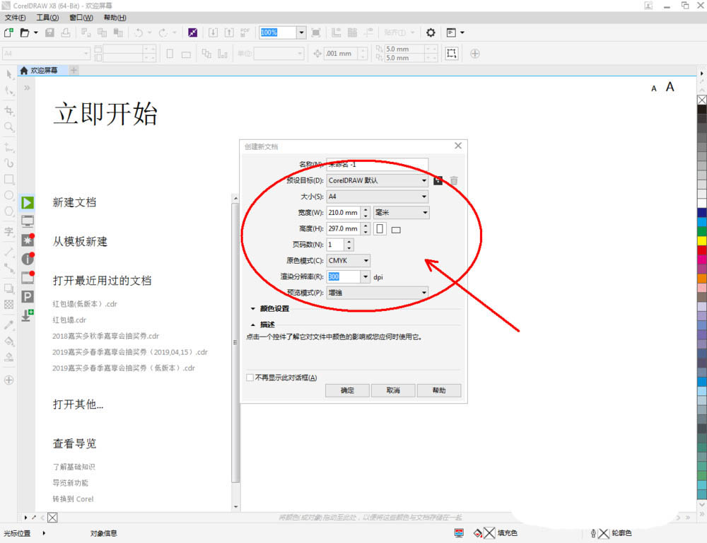 1、打開CorelDRAW X8 軟件,點擊【新建文檔】,按圖示參數新建一個cdr文檔(如圖所示);