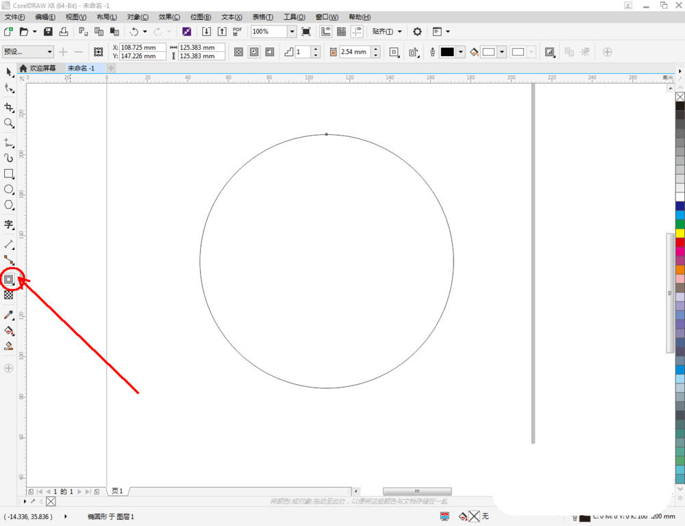 2、點擊【橢圓形工具】在作圖區域繪制一個圓形圖案。點擊【輪廓圖】拉動圓形圖案進行輪廓處理后,點擊鼠標右鍵-【拆分輪廓圖群組】將圖案拆分(如圖所示);