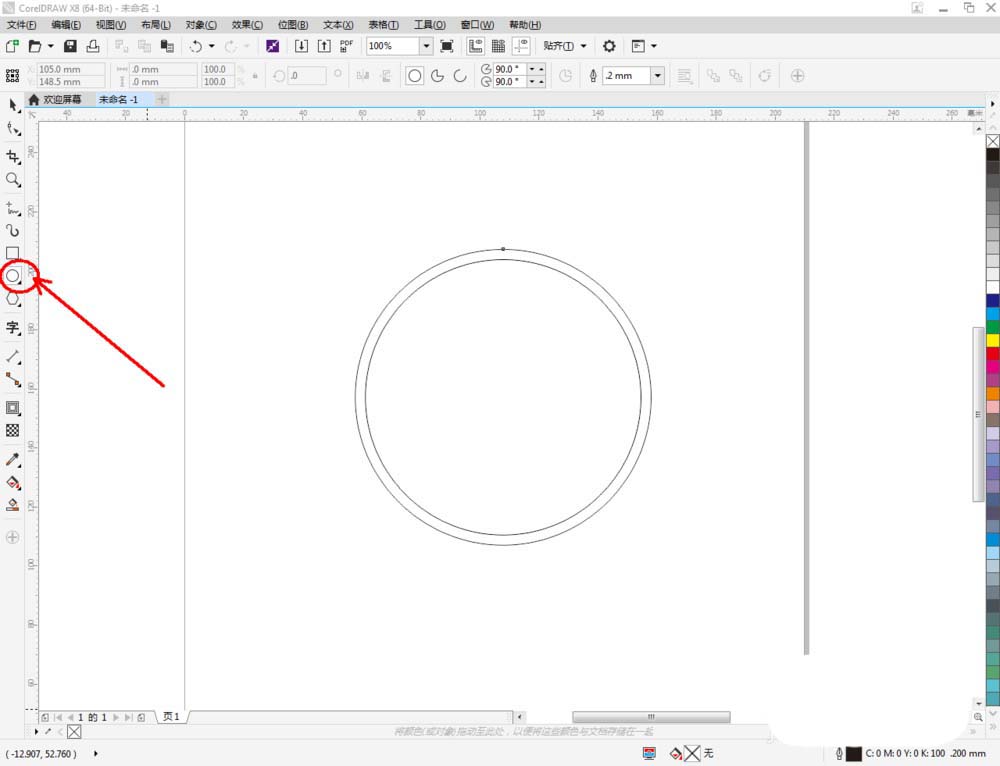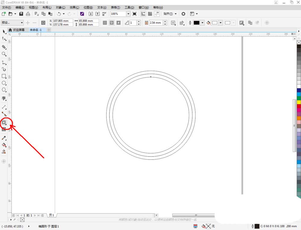 3、點擊【橢圓形工具】在作圖區(qū)域繪制另外一個圓形圖案。點擊【輪廓圖】拉動圓形圖案進行輪廓處理后,點擊鼠標右鍵-【拆分輪廓圖群組】將圖案拆分(如圖所示);