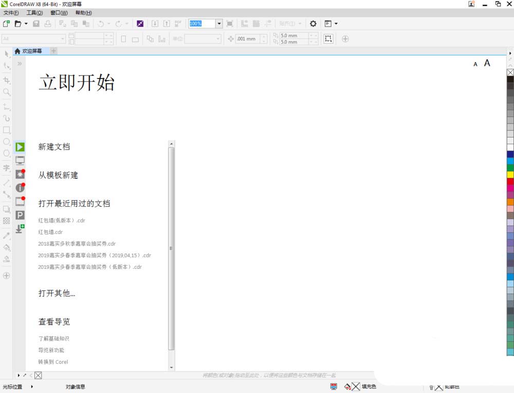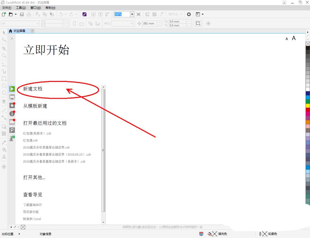 1、打開CorelDRAW X8 軟件,點擊【新建文檔】,按圖示參數(shù)新建一個cdr文檔(如圖所示);