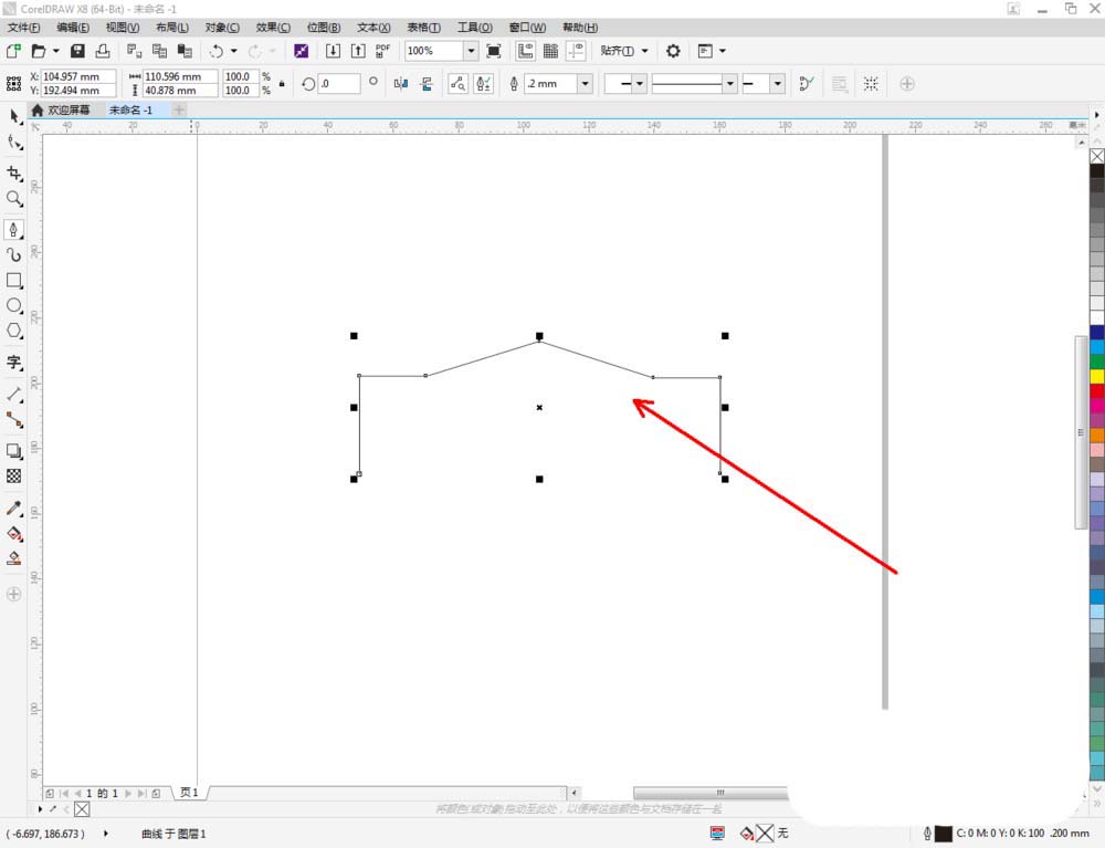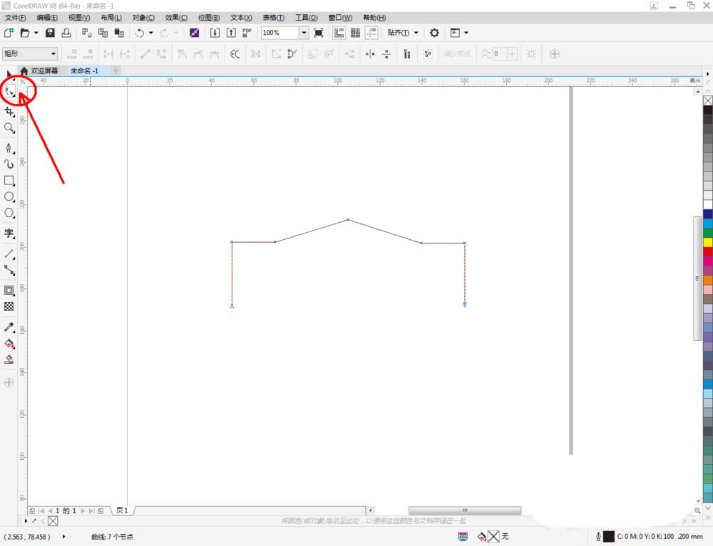 2、點擊【鋼筆工具】按圖示在作圖區域繪制出一個線段圖案。點擊【形狀工具】,框選所有的節點后,點擊【轉化為曲線】將節點轉曲。完成后,選中圖示圖案上的節點,點擊【平滑節點】將節點進行平滑處理并調整好控制點(如圖所示);