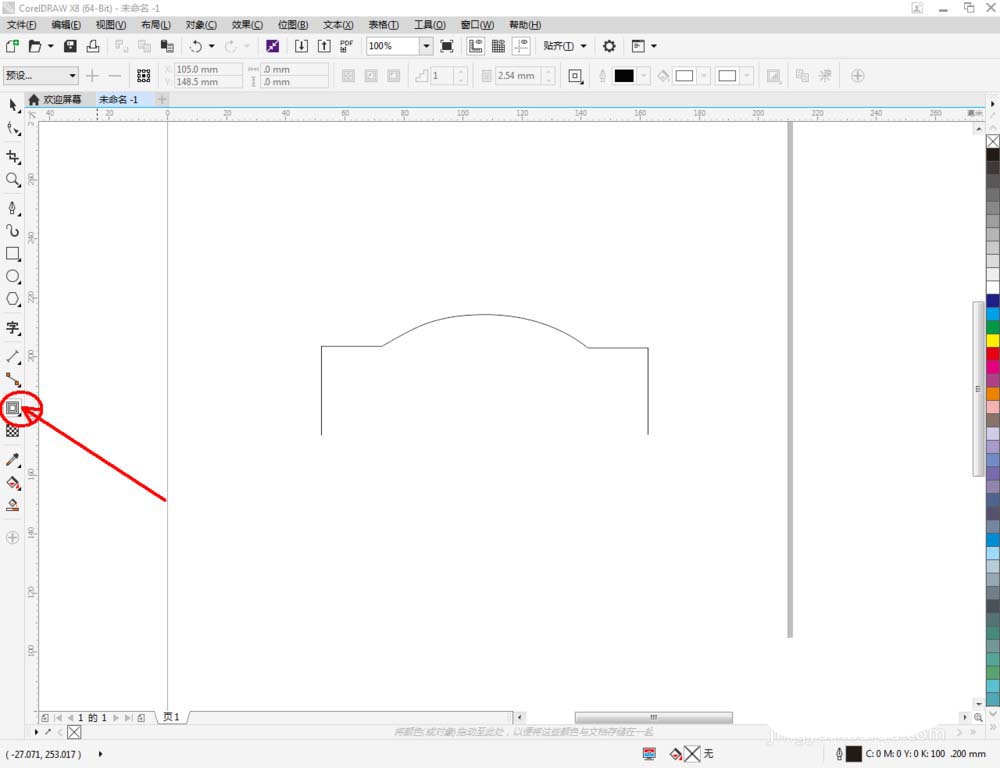 3、點擊【輪廓圖】按圖示對線段圖案進行輪廓處理。點擊鼠標右鍵-【拆分輪廓圖群組】將圖案群組拆分后,將線段圖案刪除(如圖所示);