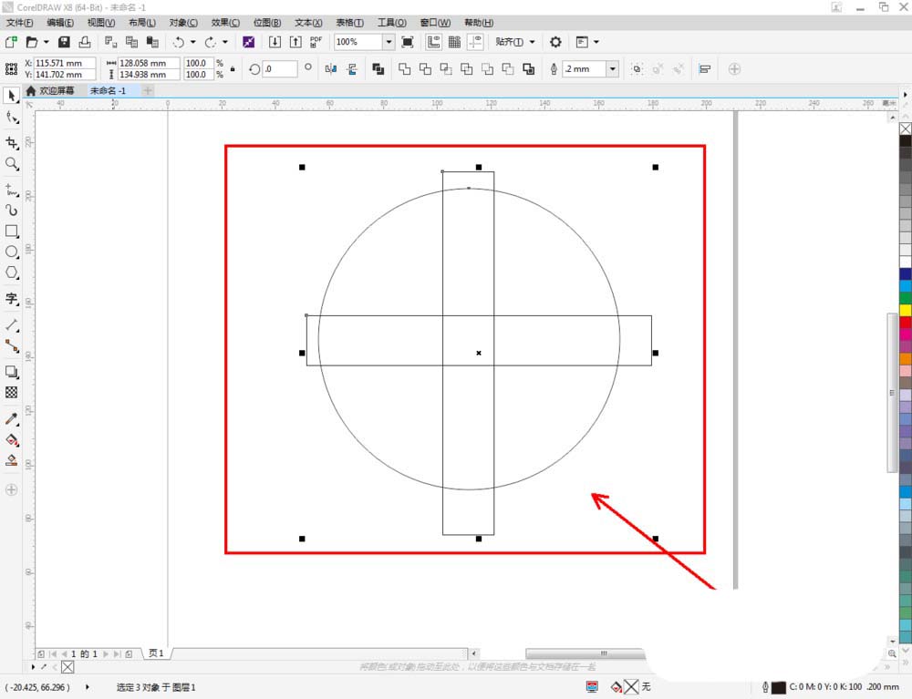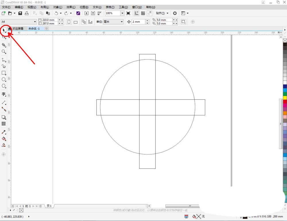 2、點擊【橢圓形工具】在作圖區域繪制一個圓形圖案后,點擊【矩形工具】繪制出一個橫向矩形圖案和一個縱向矩形圖案。完成后,調整好圖案間的位置關系(如圖所示);