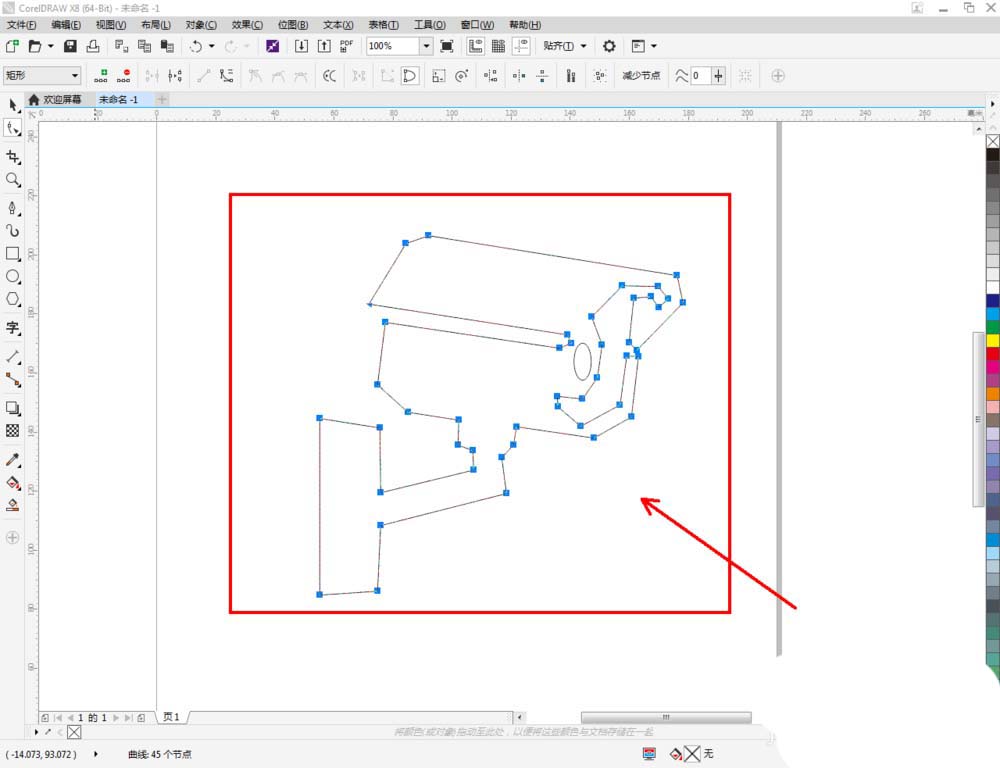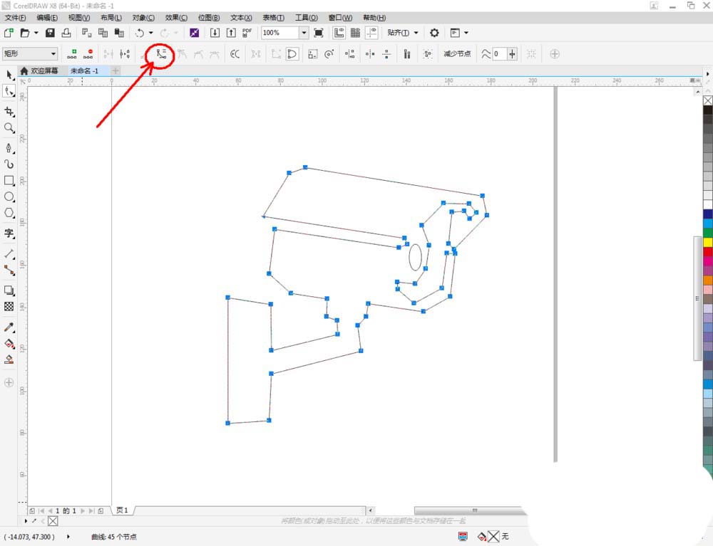 3、選中多邊圖案,點擊【形狀工具】,選中圖案上的所有點,點擊【轉換為曲線】將圖案轉曲后,按圖示調整控制點,完成整個監控攝像頭輪廓圖案的繪制(如圖所示);