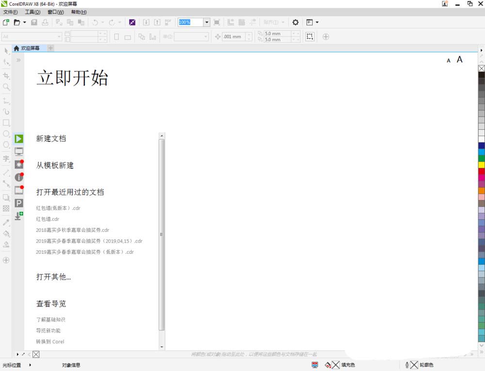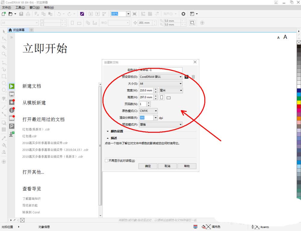 1、打開(kāi)CorelDRAW X8 軟件,點(diǎn)擊【新建文檔】,按圖示參數(shù)新建一個(gè)cdr文檔(如圖所示);