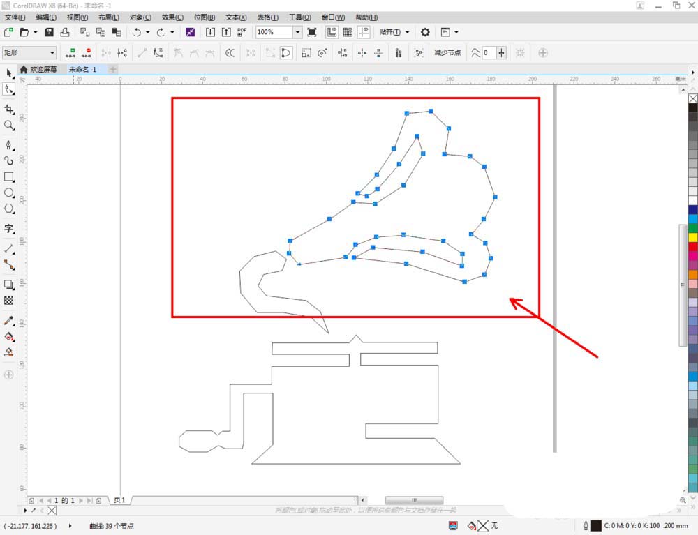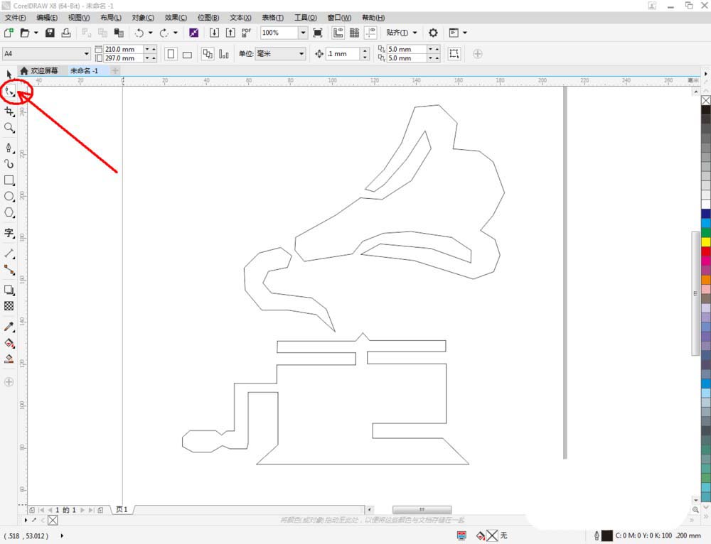 2、點(diǎn)擊【鋼筆工具】,按圖示在作圖區(qū)域繪制幾個(gè)多邊圖案組成留聲機(jī)圖標(biāo)的大致輪廓(如圖所示);