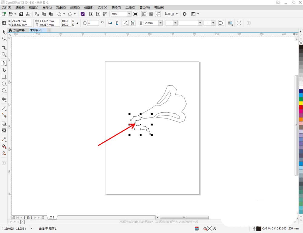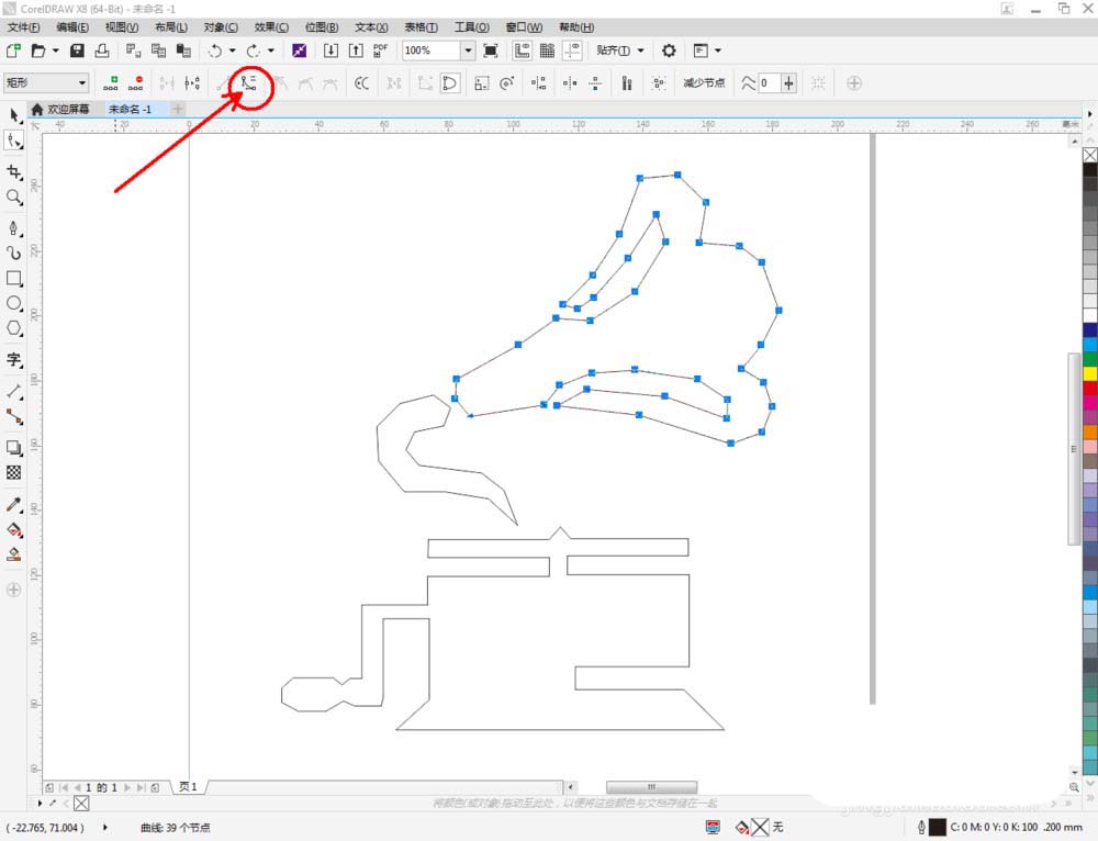 3、選中多邊圖案,點(diǎn)擊【形狀工具】,選中喇叭口圖案上的所有點(diǎn),點(diǎn)擊【轉(zhuǎn)換為曲線(xiàn)】將圖案轉(zhuǎn)曲后,按圖示調(diào)整控制點(diǎn),完成喇叭口圖案的繪制(如圖所示);