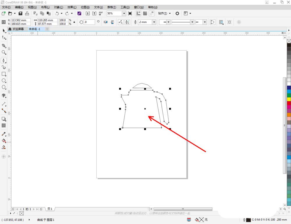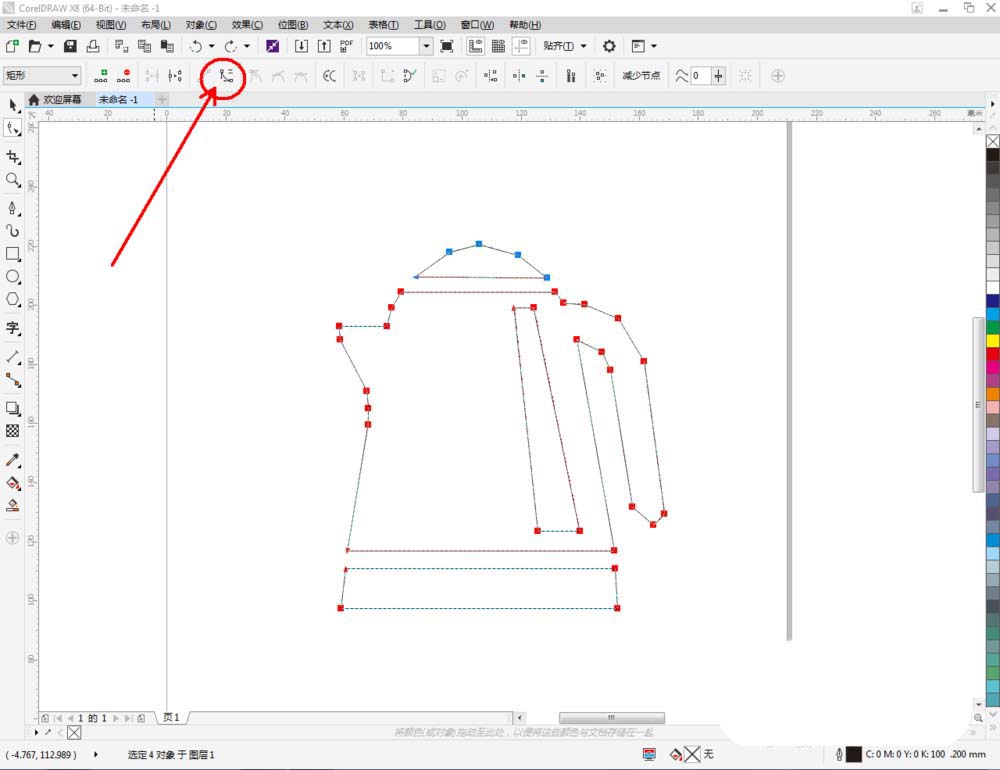 3、選中多邊圖案,點擊【形狀工具】,選中圖案上的所有點,點擊【轉換為曲線】將圖案轉曲后,按圖示調整控制點,完成整個電熱水壺輪廓圖案的繪制(如圖所示);