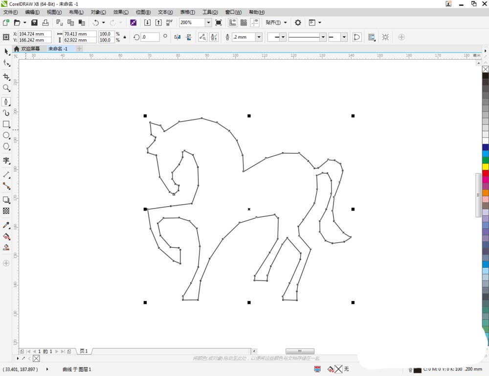 3、選中多邊圖案,點擊【形狀工具】,選中圖案上的所有點,點擊【轉換為曲線】將圖案轉曲后,按圖示調整控制點,完成整個生肖馬輪廓圖案的繪制(如圖所示);