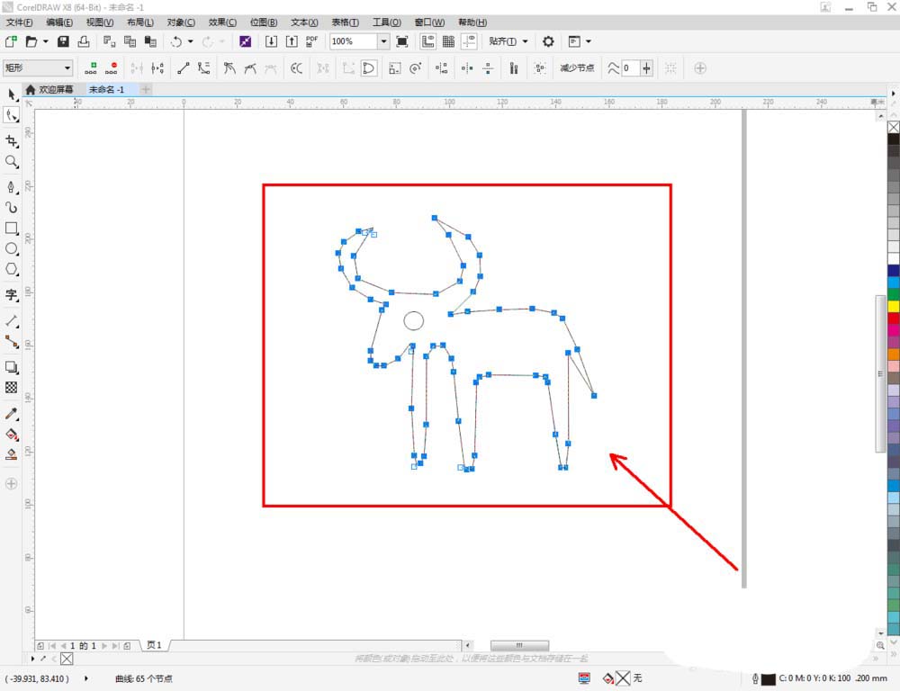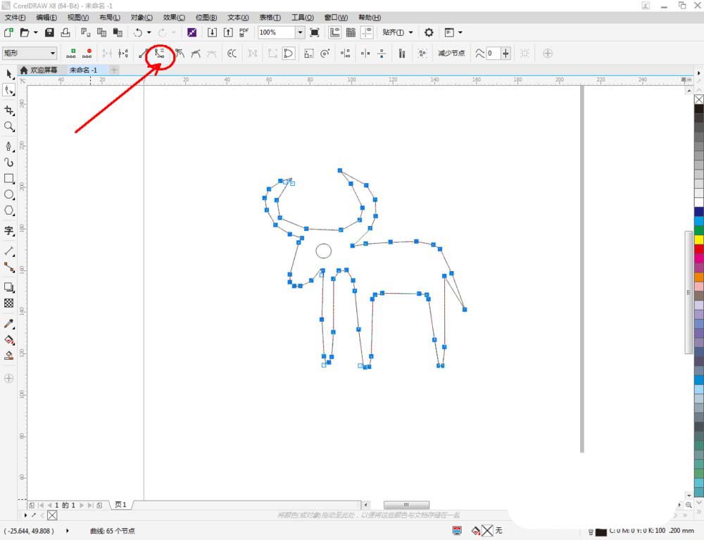 3、選中多邊圖案,點(diǎn)擊【形狀工具】,選中圖案上的所有點(diǎn),點(diǎn)擊【轉(zhuǎn)換為曲線】將圖案轉(zhuǎn)曲后,按圖示調(diào)整控制點(diǎn),完成整個(gè)生肖牛輪廓圖案的繪制(如圖所示);