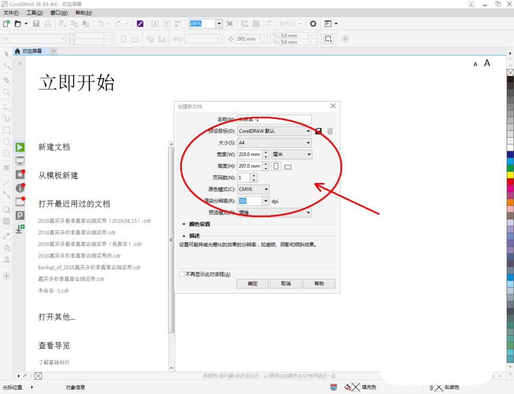 1、打開CorelDRAW X8軟件,點擊【新建文檔】,按圖示參數新建一個cdr文檔(如圖所示);