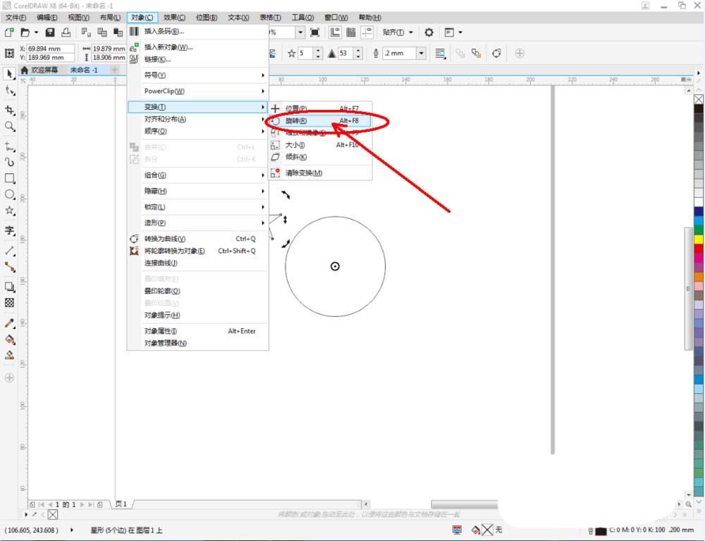 3、點擊【對象】-【變換】-【旋轉】,將變換窗口調出到右邊工作區處(如圖所示);