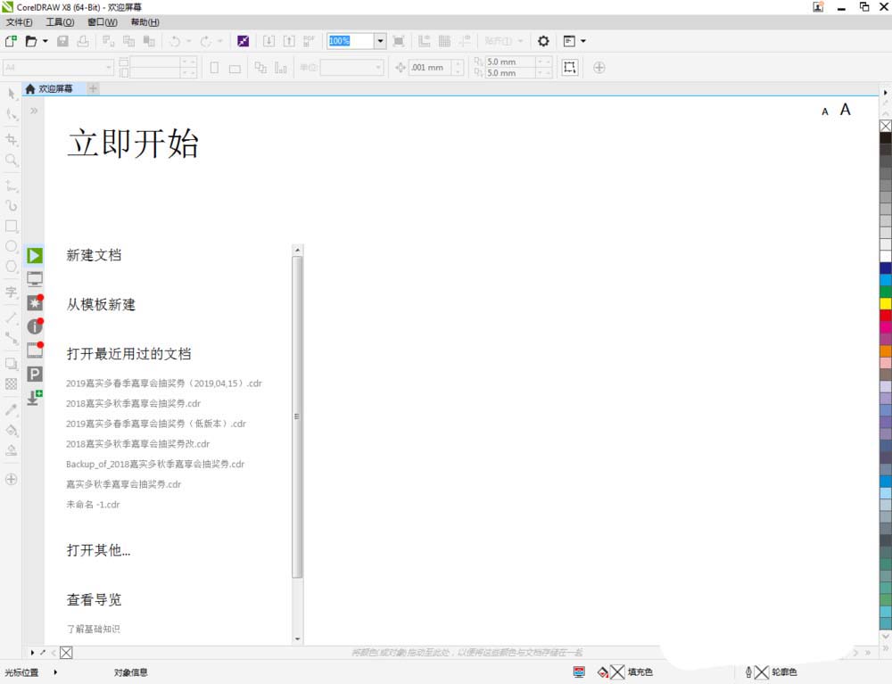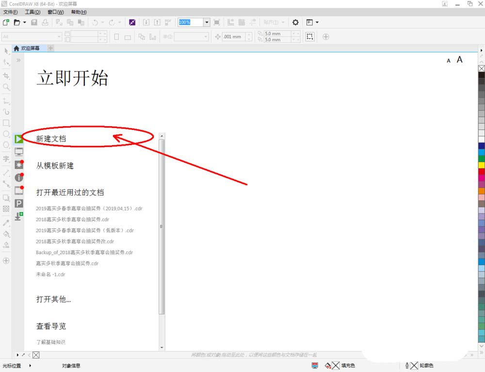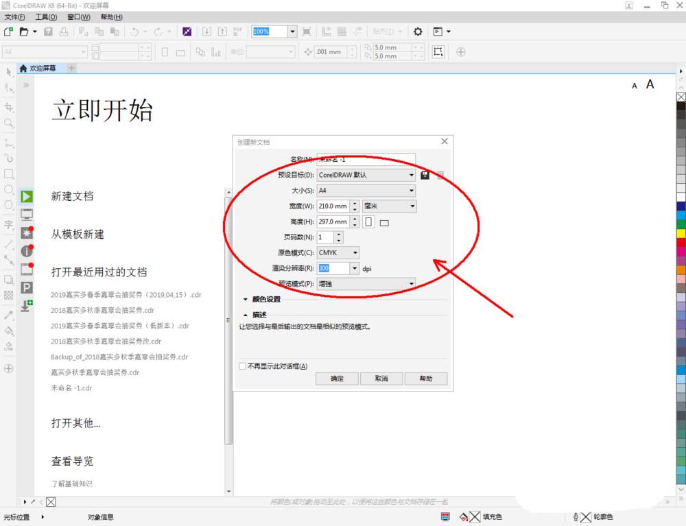 1、打開CorelDRAW X8軟件,點擊【新建文檔】,按圖示參數新建一個cdr文檔(如圖所示);