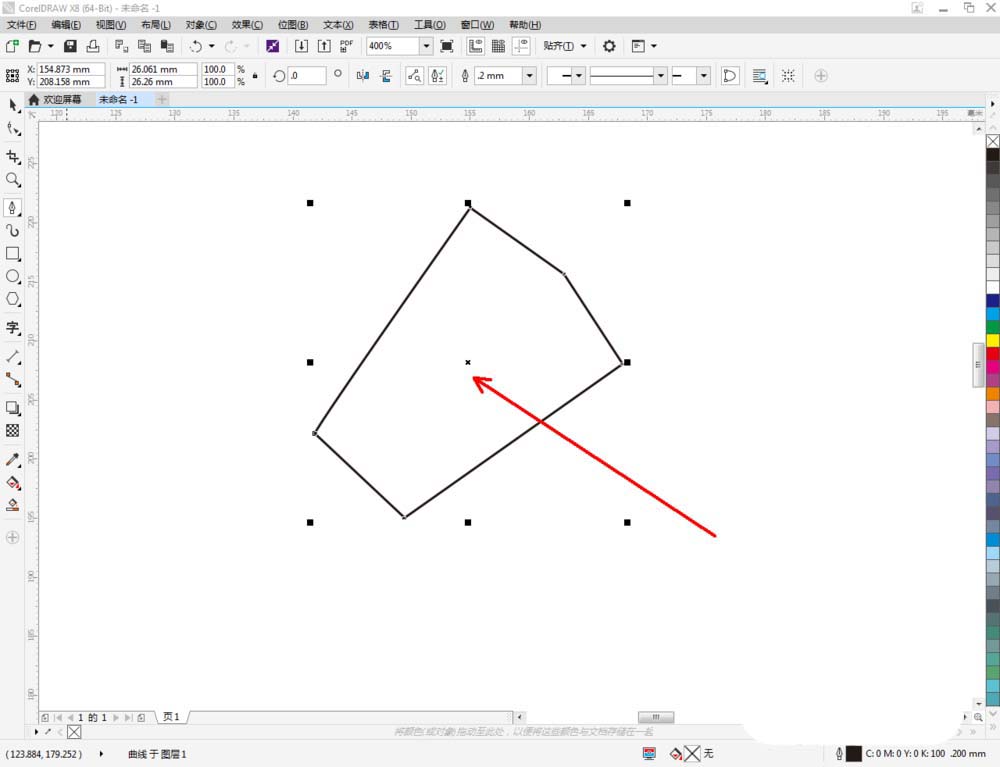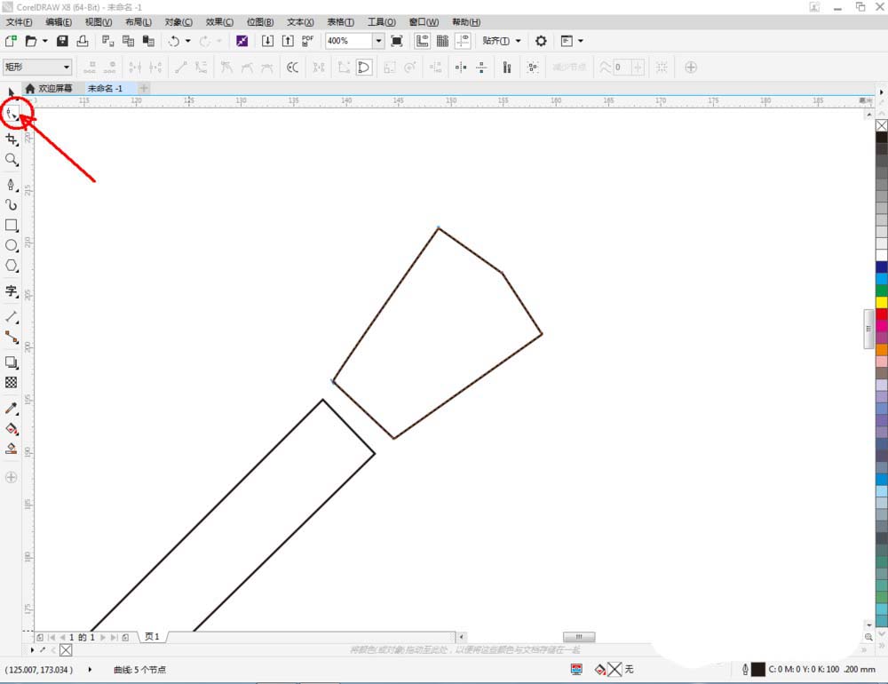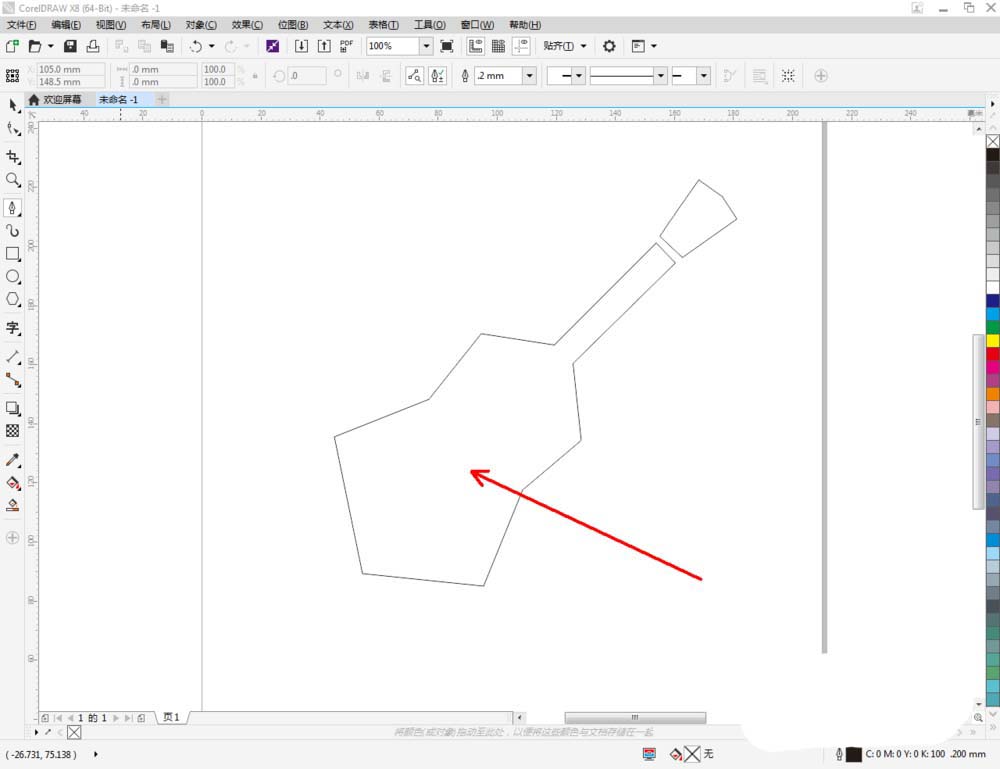 2、點擊【鋼筆工具】,在作圖區域繪制一個多變圖案,繼續在下方繪制尤克里里圖標的主體部分。完成后,點擊【選擇工具】,選中整個圖案,按圖示對圖案進行縮放;