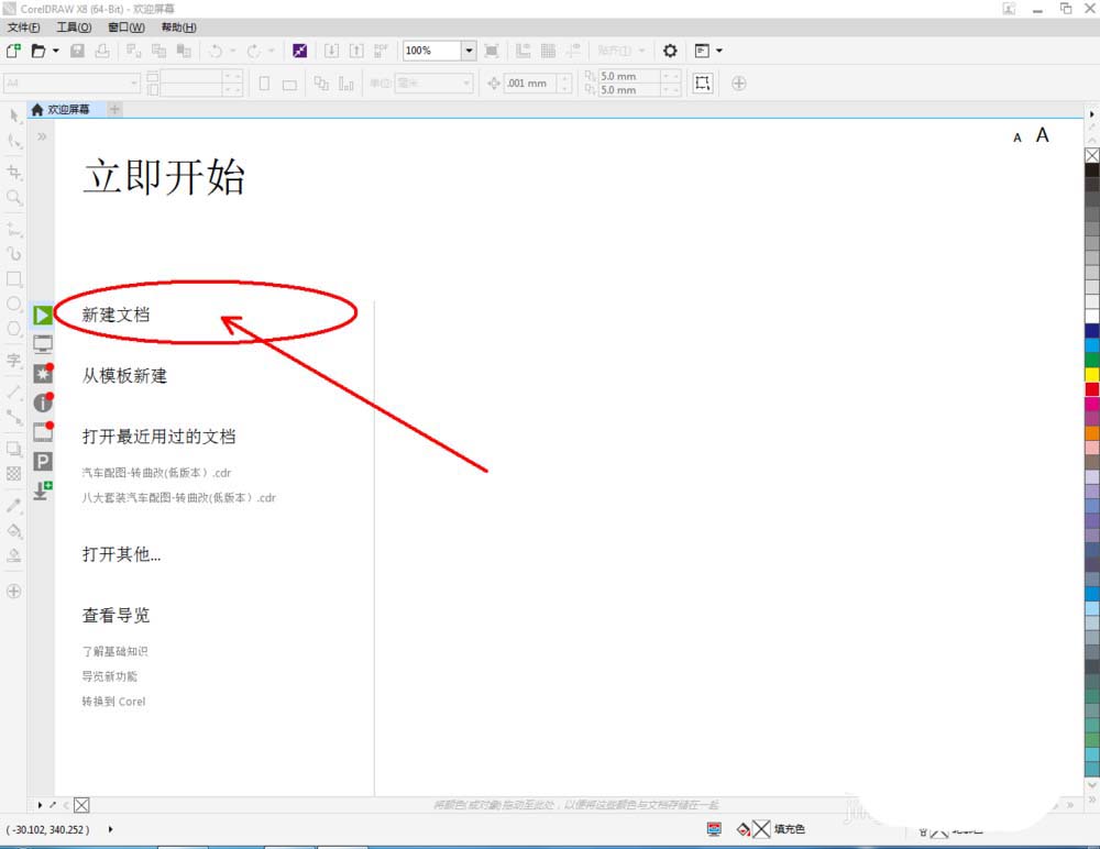1、打開CorelDRAW X8軟件,點擊【新建文檔】,并按圖示設置好cdr文檔的各個參數(如圖所示);