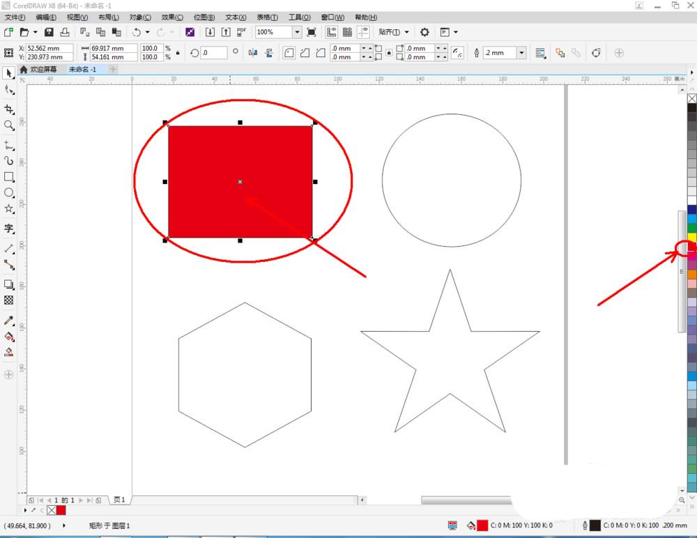 3、點擊【選擇工具】,選中矩形圖案后,鼠標左鍵點擊右邊色板中的紅色,對矩形圖案進行填充。按照同樣的步驟,完成對其他幾個圖案顏色的填充(如圖所示);