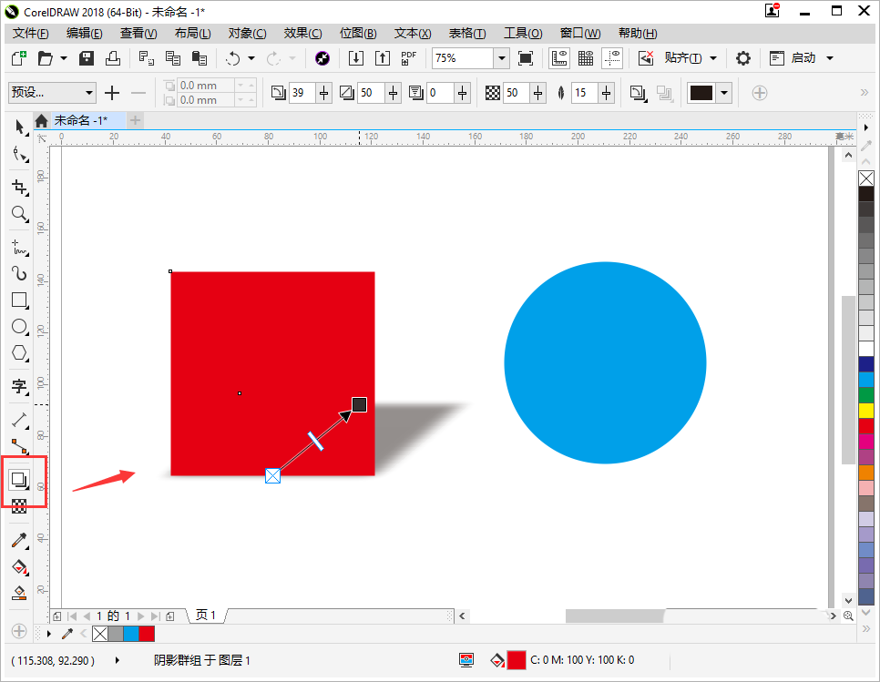 4、鼠標(biāo)選中左側(cè)的方形,點(diǎn)擊工具欄中的【投影】工具,然后在紅色方形上做一個(gè)投影,那怎么把一模一樣的投影寶貝到藍(lán)色圓形上呢