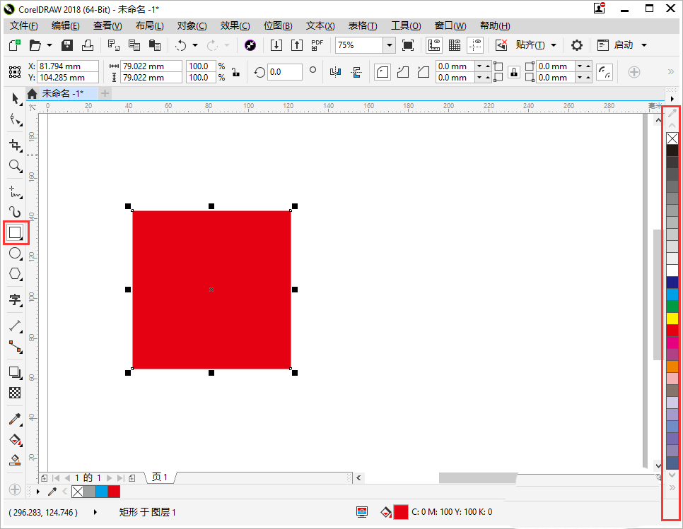 2、在左側(cè)工具欄中選擇【矩形工具】,在畫布中繪制一個(gè)正方形,并用鼠標(biāo)左鍵點(diǎn)擊右側(cè)的紅色,這樣就畫出了一個(gè)紅色正方形