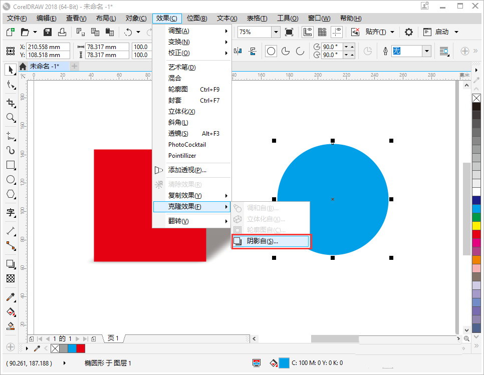 5、鼠標(biāo)選中藍(lán)色圓形,點(diǎn)擊【效果】-【克隆效果】-【陰影】