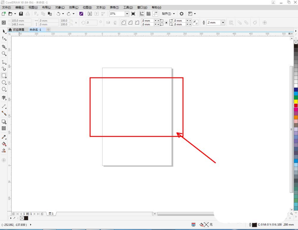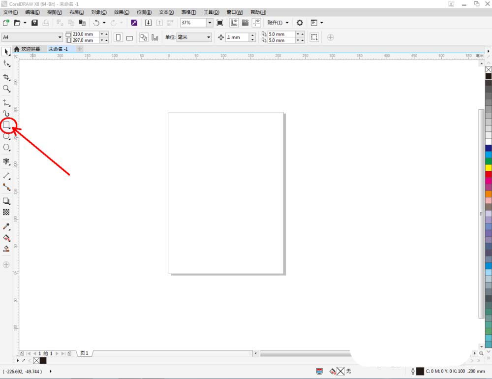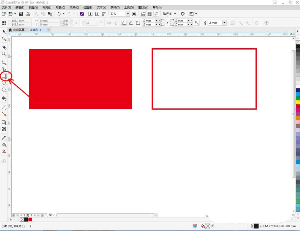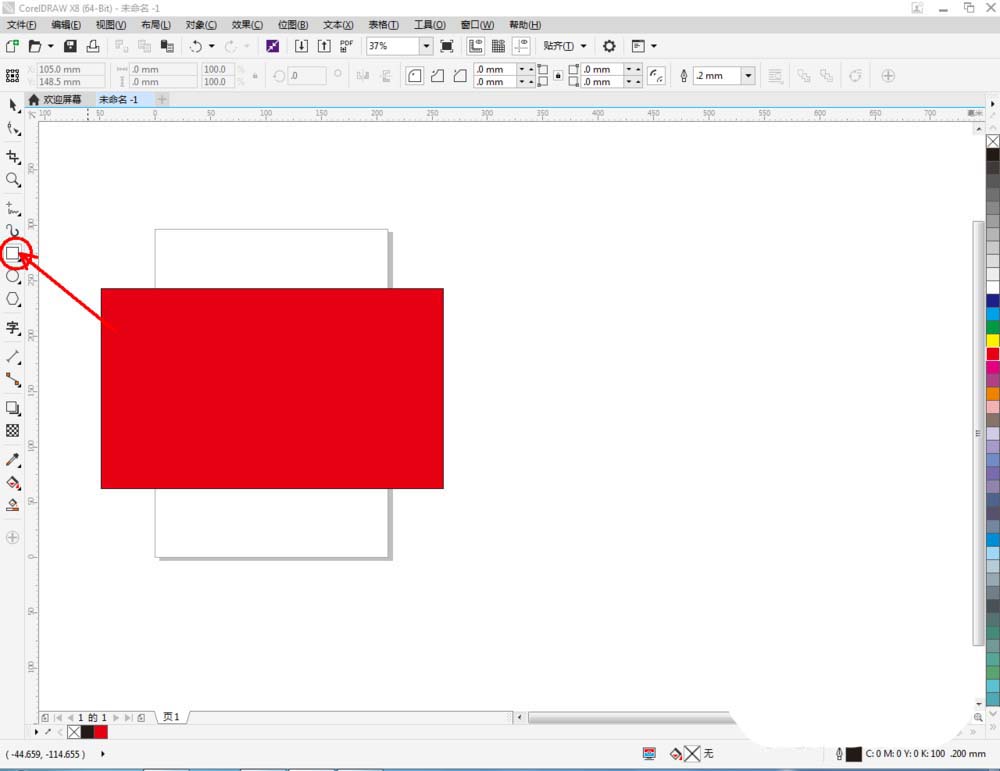 1、打開CorelDRAW X8軟件,點擊【矩形工具】,在作圖區(qū)域繪制一個矩形圖案。鼠標(biāo)左鍵點擊右邊色板中的紅色,可以繪制出一個紅色矩形圖案;