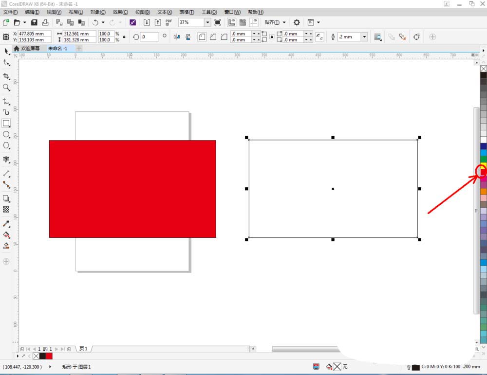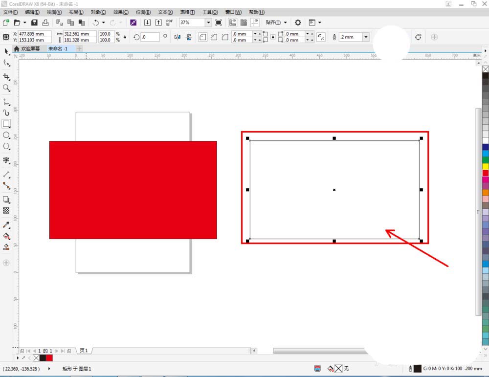2、點擊【矩形工具】,在作圖區(qū)域繪制另外一個矩形圖案。鼠標(biāo)右鍵點擊右邊色板中的紅色,可以繪制出一個紅色矩形框圖案。點擊上方【輪廓寬度】可設(shè)置方框的寬度(如圖所示);