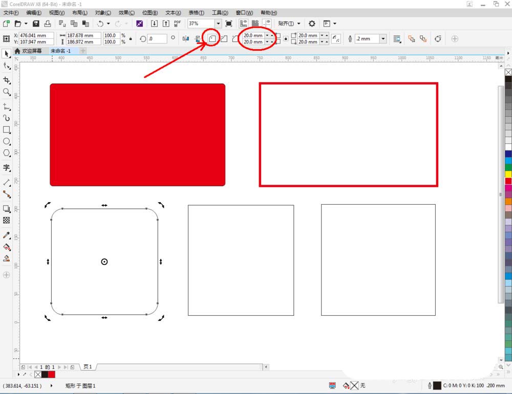 3、點擊【矩形工具】,在作圖區(qū)域繪制三個矩形圖案。分別點擊上方的【圓角】、【扇形角】、【倒角】,并分別設(shè)置好參數(shù)大小,制作出化角后的矩形圖案(如圖所示);