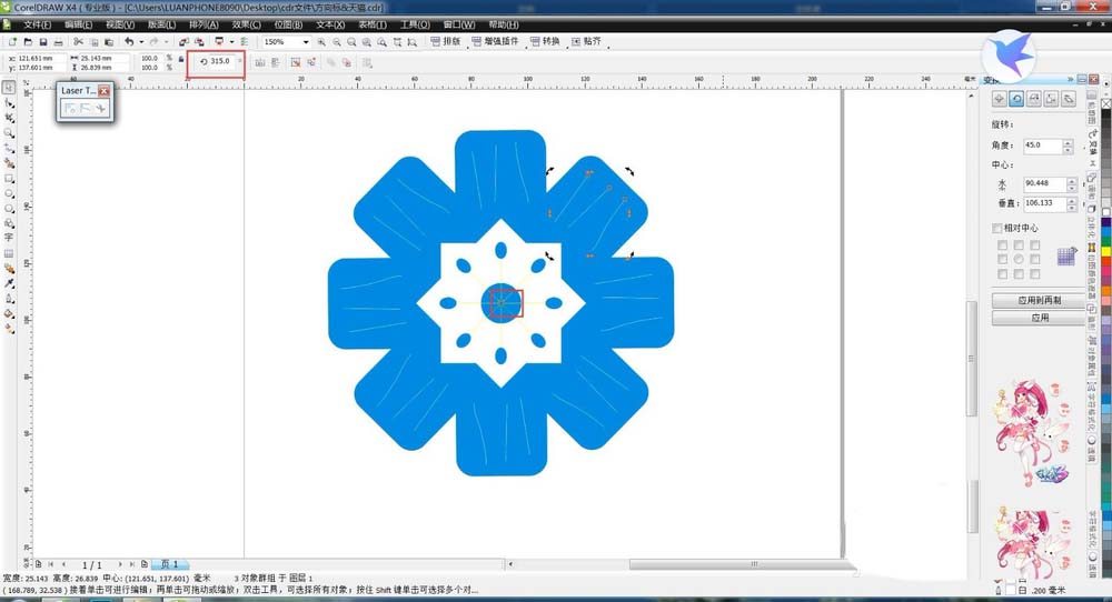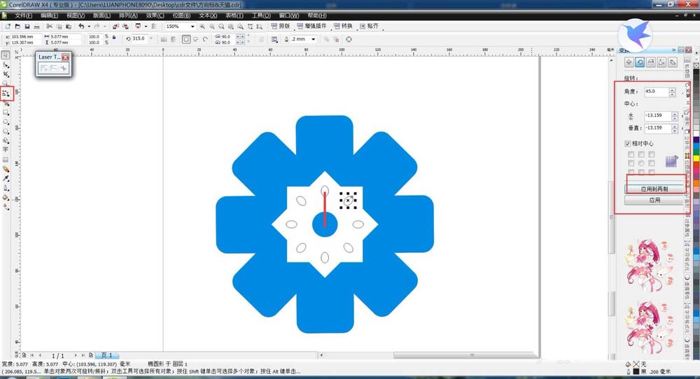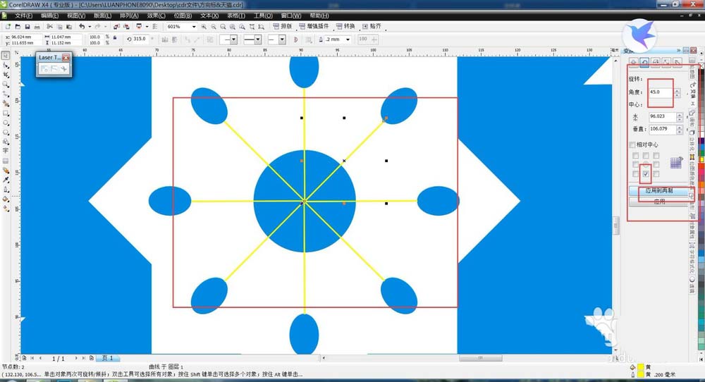 5、橢圓工具選一個橢圓,畫一條直線做輔助線,用測量工具測出橢圓中心與圓的中心距離,變形旋轉選擇相對中心,得到圍繞圓的一環橢圓,ctrl+g群組,選擇圖層減去前面圖形