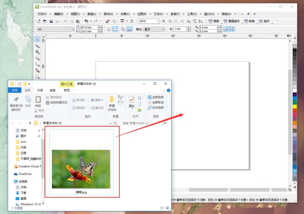 1、打開CDR軟件新建一個畫板,再打開圖片所在的文件夾,鼠標選中圖片直接拖到CDR中,