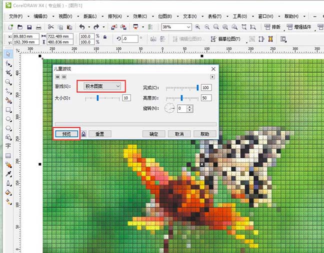 4、把游戲設置為【積木圖案】,適當設置大小和亮度,點擊左下角【預覽】可以看到圖片處理的效果,還是很有趣的