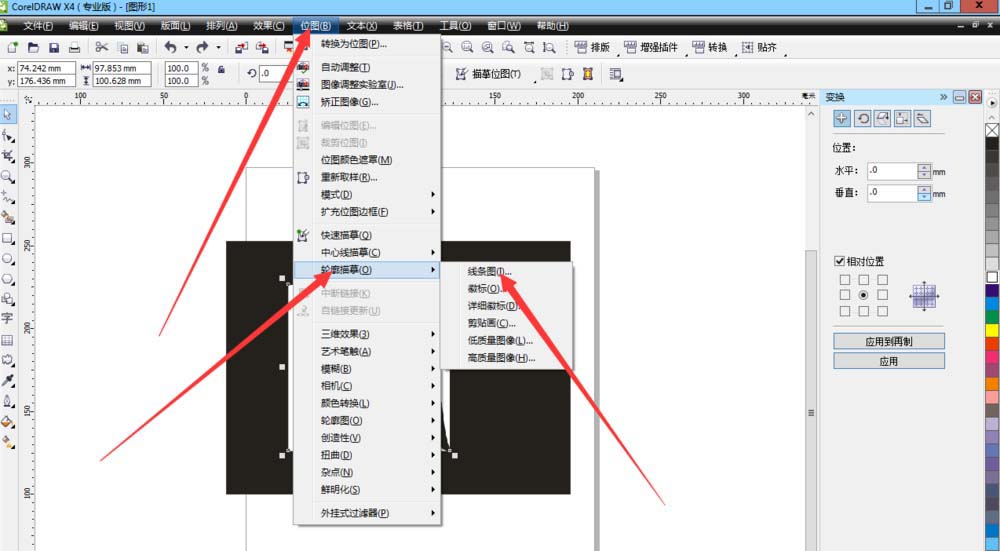 4、單擊字體,選擇位圖——輪廓描摹——線條圖,轉成線條圖、顏色黑白兩色。