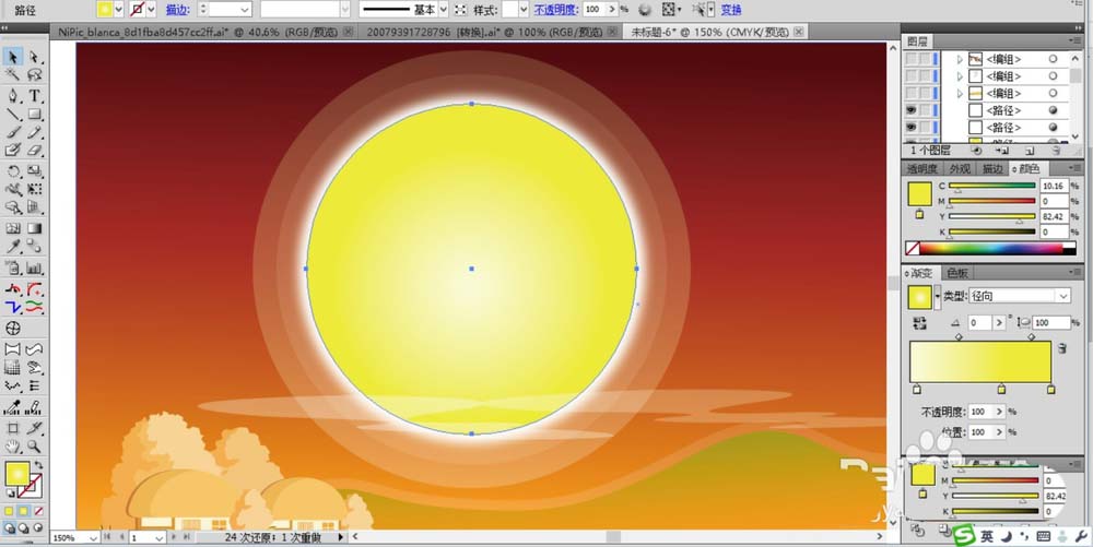 5、在畫面的左側上方我們繪制出大大的圓形月亮并用黃色的徑向漸變填充,在月亮的后面做出一個更大的白色圓形并用一下模糊濾鏡從而成為光影效果。后方再復制多個白色的圓形使用一下半透明的效果,從而成為虛影,在月亮的下方再制作出白云的效果。