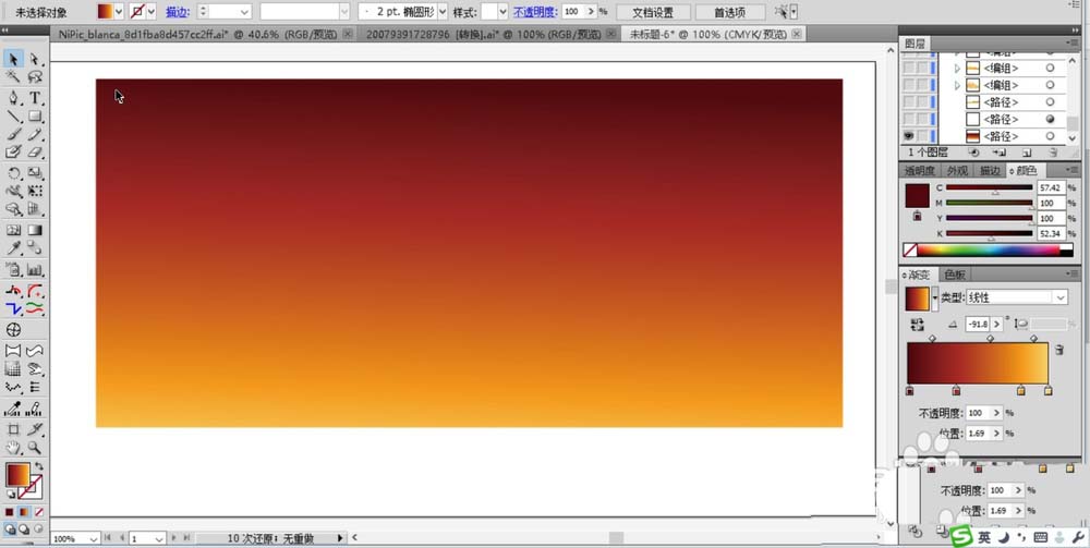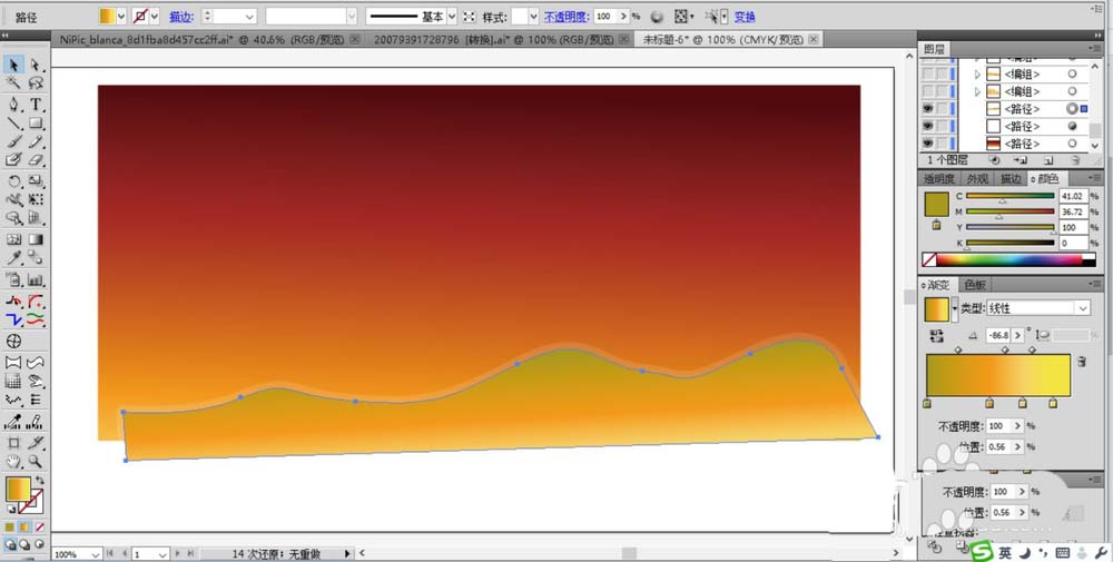 2、使用鋼筆在畫面的下方勾勒出山峰的起伏坡度路徑并填充為淺橙黃色的漸變。