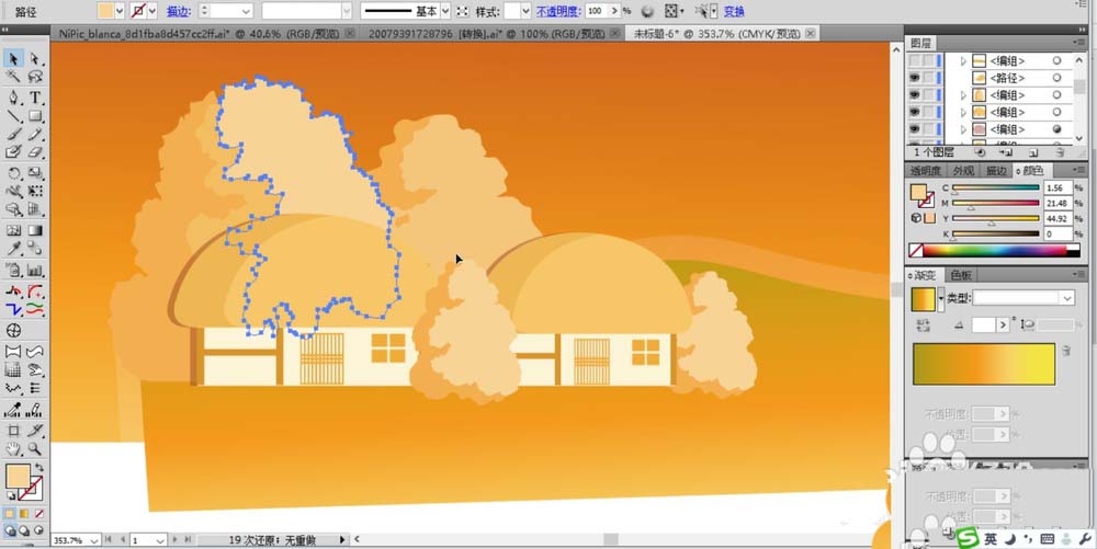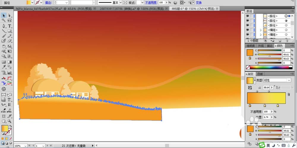 4、接下來,我們在房屋的下方用鋼筆勾勒出草地的輪廓效果并用橙黃色到黃色的漸變填充。