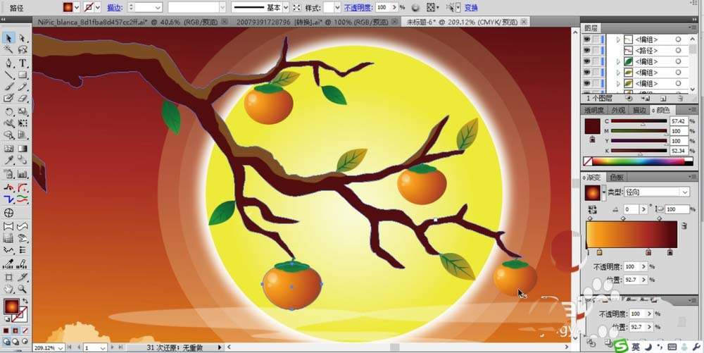 6、接著,我們在月亮的前方繪制出一個柿子樹的枝頭輪廓,并填充為棕褐色,用兩種不同的色調呈現光線的色調變化。在枝頭繪制出柿子的基本輪廓,我們用橙黃色的漸變填充柿子,頂部繪制出葉片的輪廓并填充綠色。在枝頭繪制出葉片的基本輪廓再用綠色的漸變填充。
